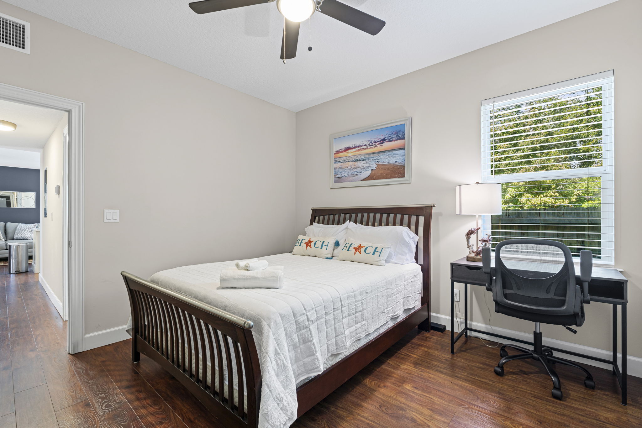Unwind in this bright coastal escape that comfortably sleeps 4 guests. Relax on the cozy sofa after a beach day, cook with ease in the full kitchen, and recharge in a peaceful bedroom designed for comfort. Warm wood floors and calming tones create a welcoming vibe throughout. Just minutes from Amelia Island’s history museum, beaches, local seafood spots, charming boutiques, and scenic bike paths, this Fernandina retreat is the perfect mix of relaxation and adventure.