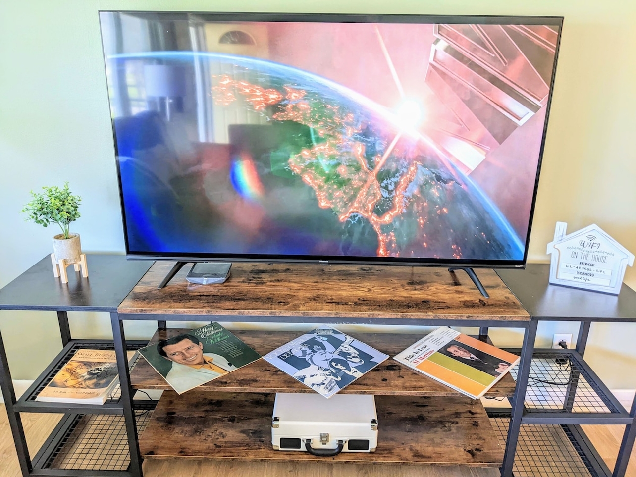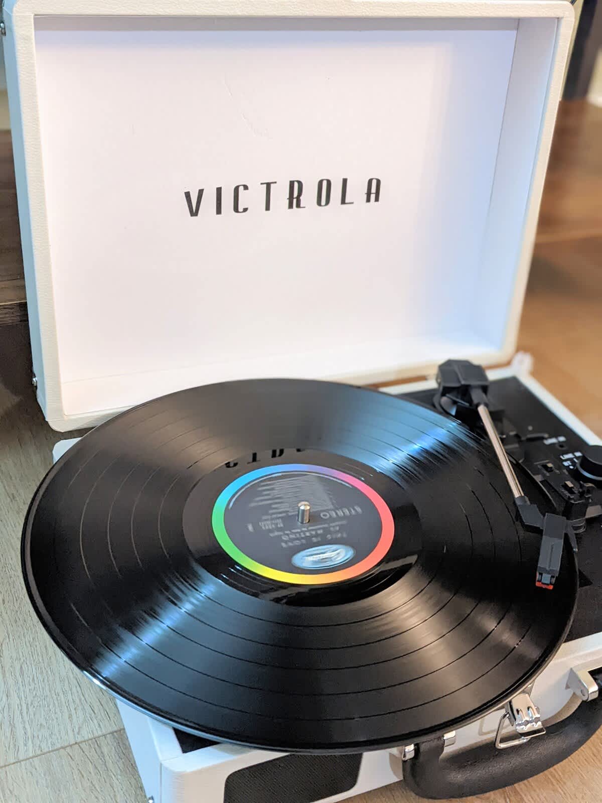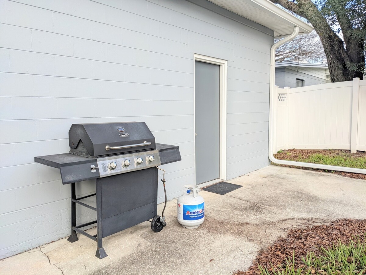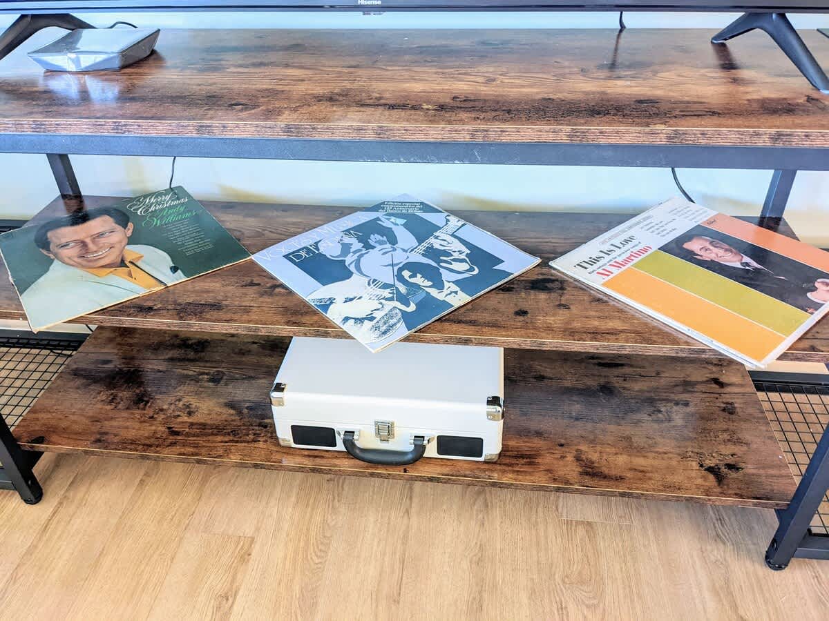 Vinyl disc record player and BBQ at your pleasure.