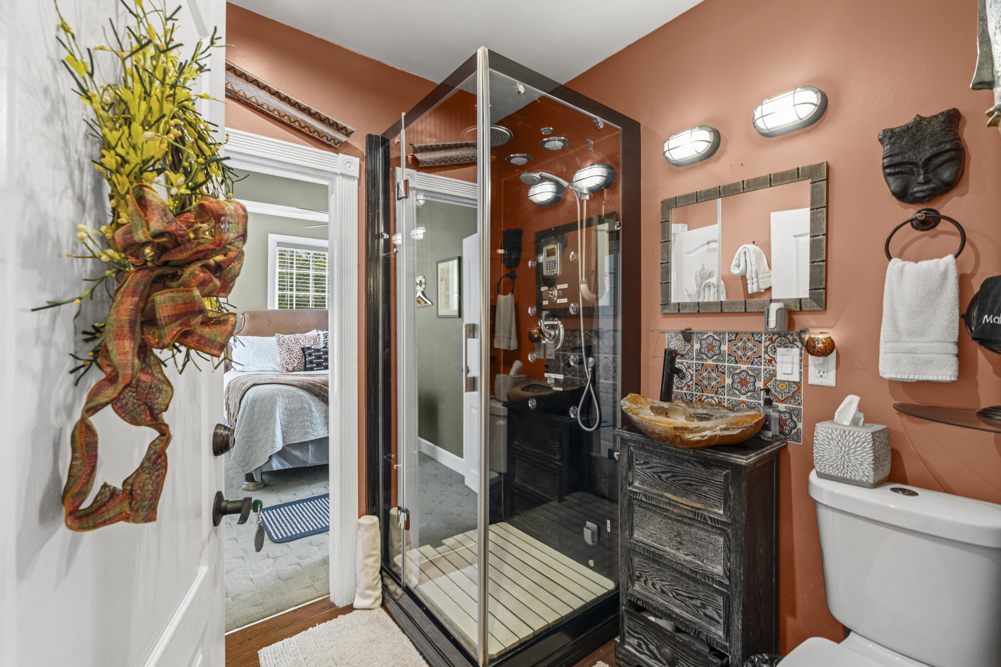 Step into our quirkiest suite, entering through a spa-like bathroom into a retreat decorated with exotic prints and artifacts. Relax in the king bed with luxury Comphy linens, or unwind on the private veranda overlooking the garden. Enjoy a modern steam shower with massage jets, rain head, and chroma-therapy lights. Located in charming Lincolnville, you’re just steps from dining, nightlife, galleries, museums, and the bayfront. A true guest favorite in a one-of-a-kind setting.