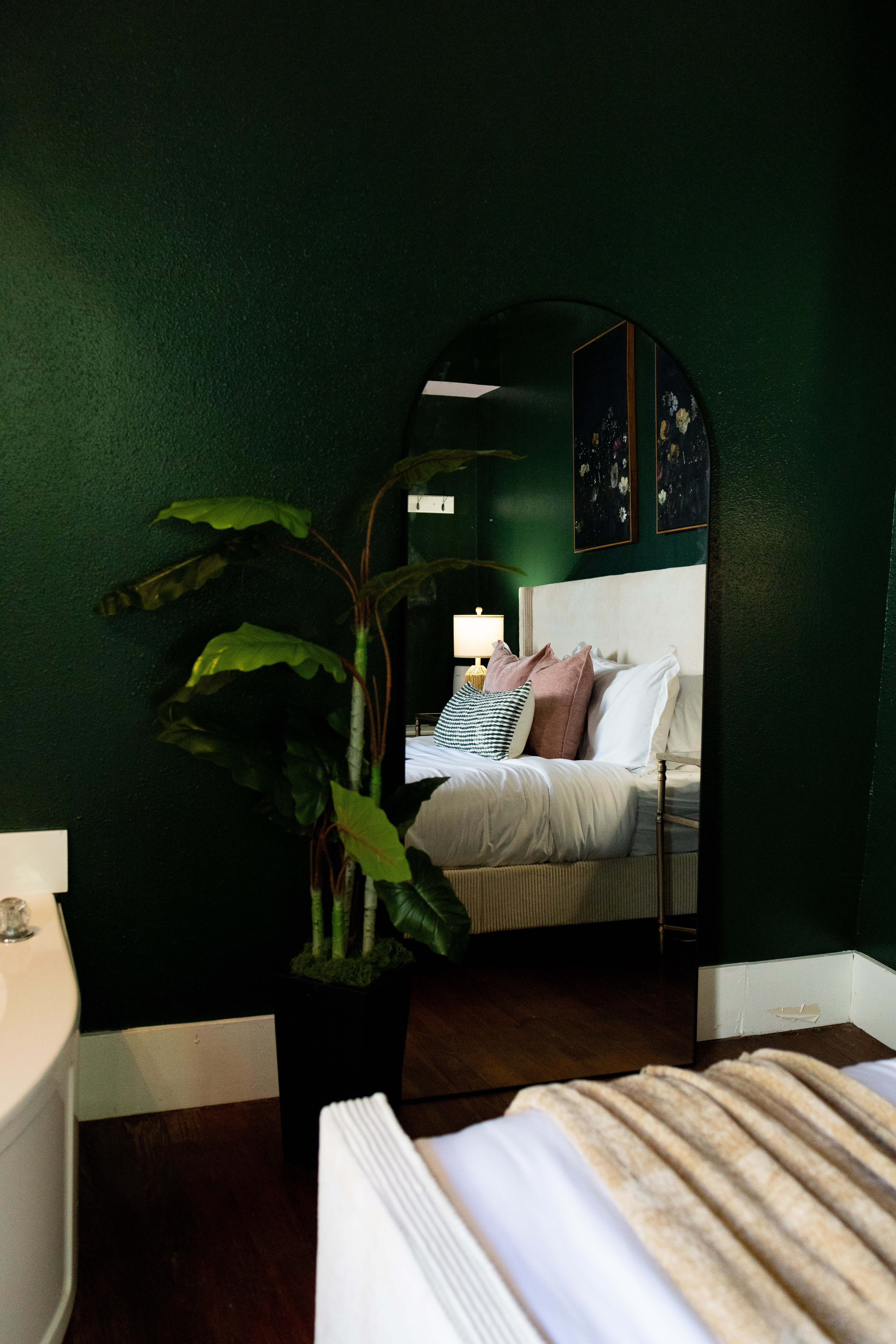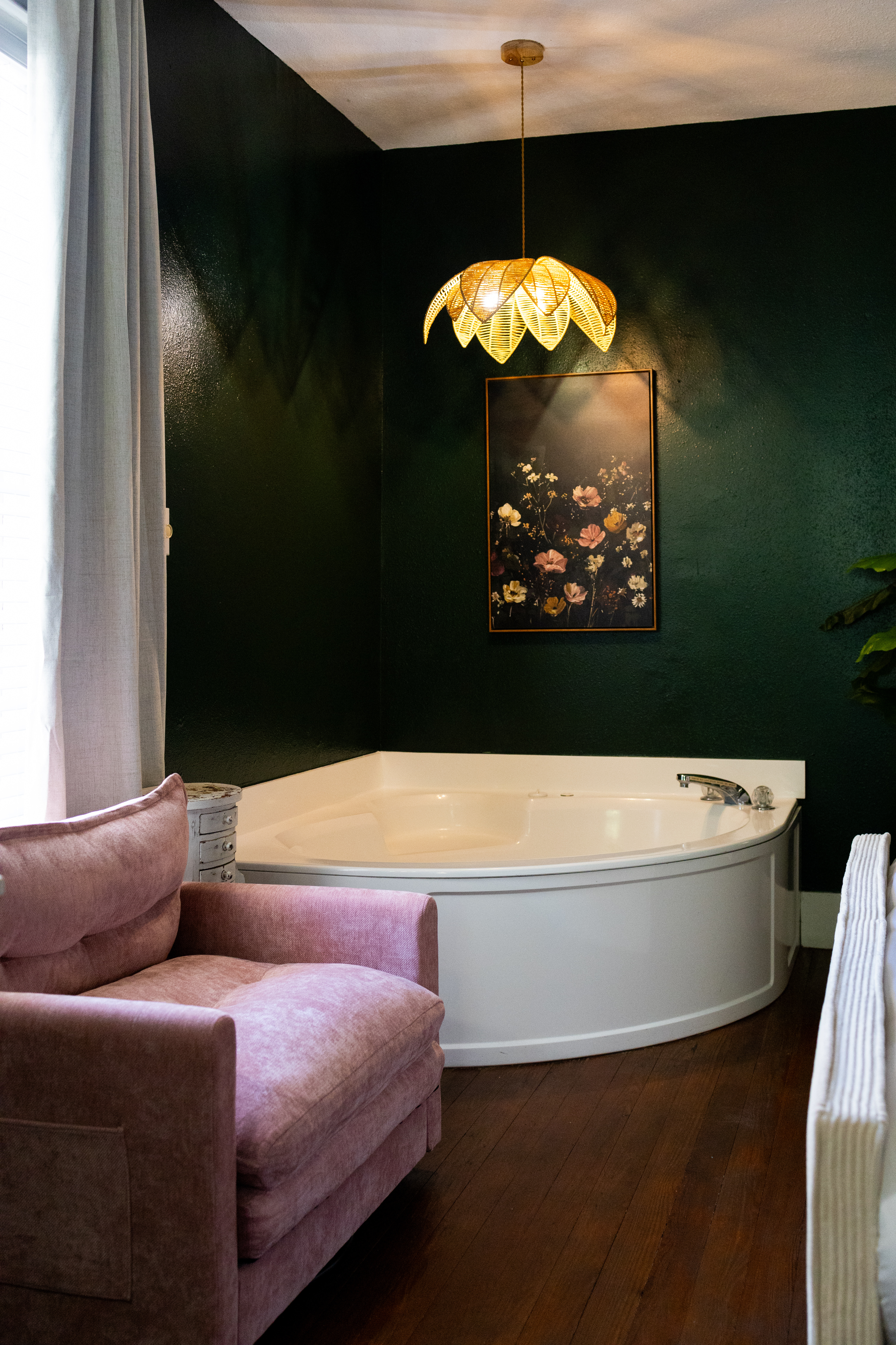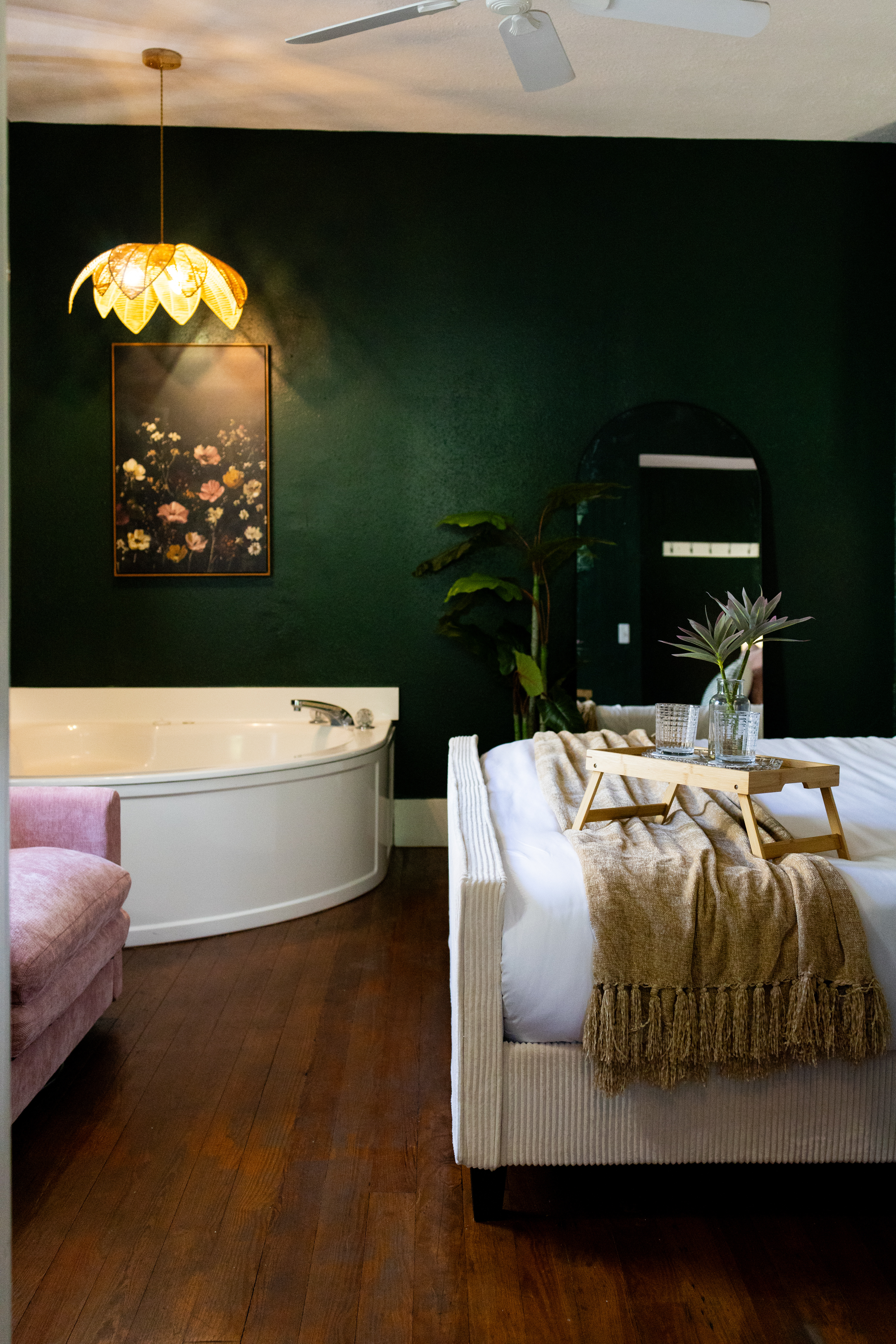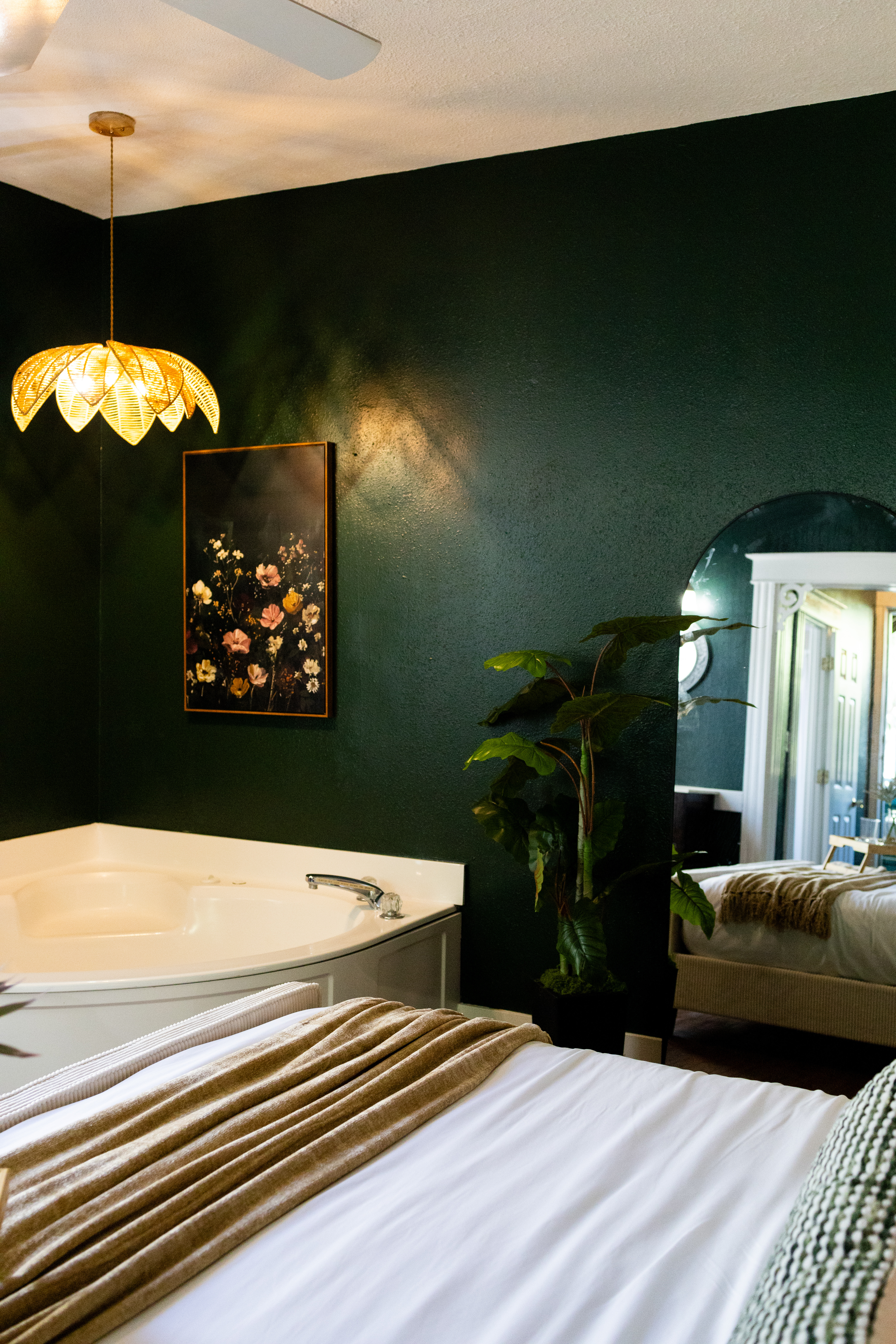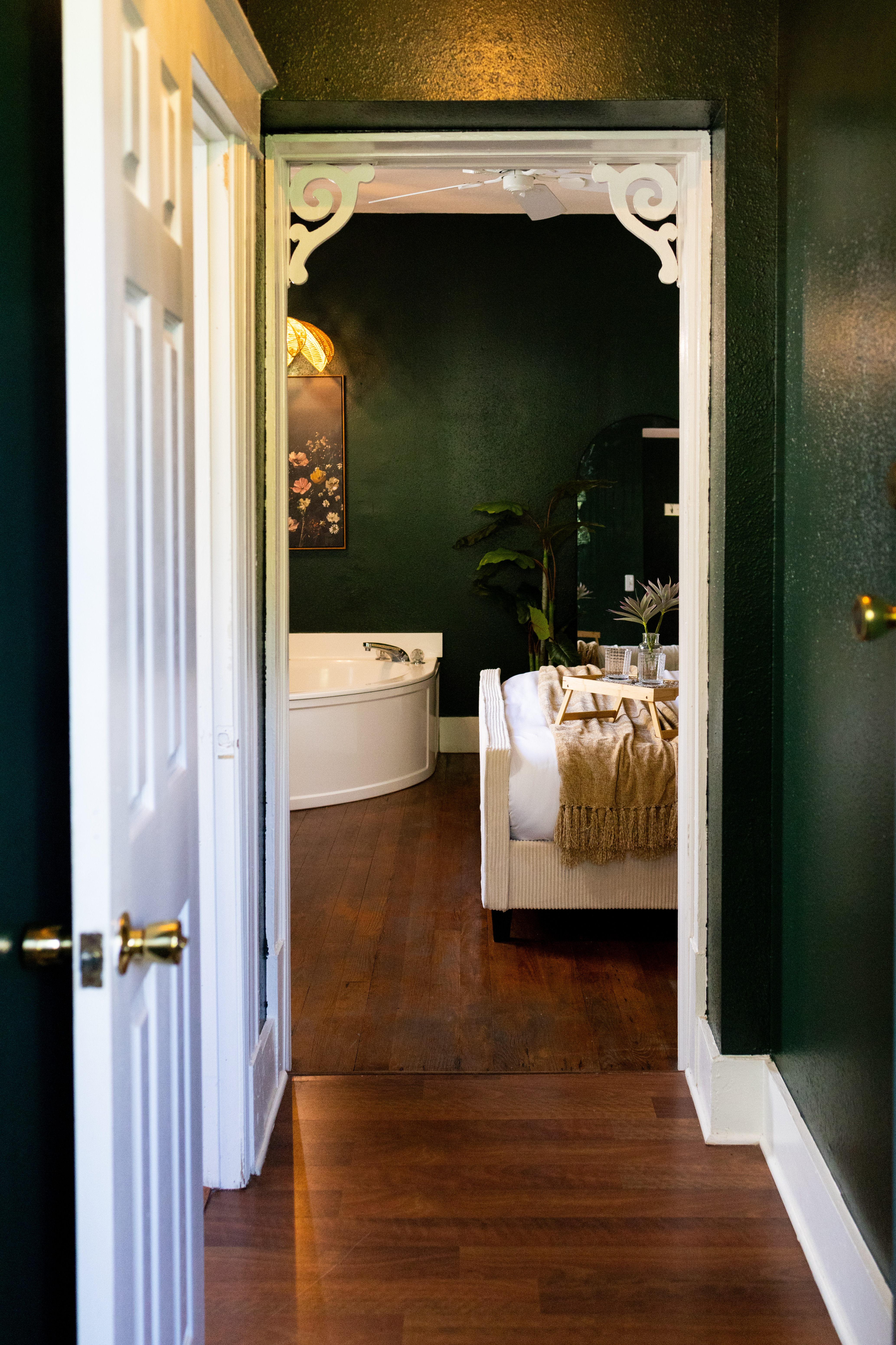 Welcome to the Honeymoon Room at Southern Wind Inn — a romantic retreat for two in the heart of historic downtown St. Augustine. This beautifully designed space features a plush king bed, rich green walls, vintage décor, and a cozy corner jacuzzi tub perfect for unwinding. Whether you’re relaxing on the pink velvet loveseat or exploring nearby cafés and cobblestone streets, every moment here feels timeless and intimate.