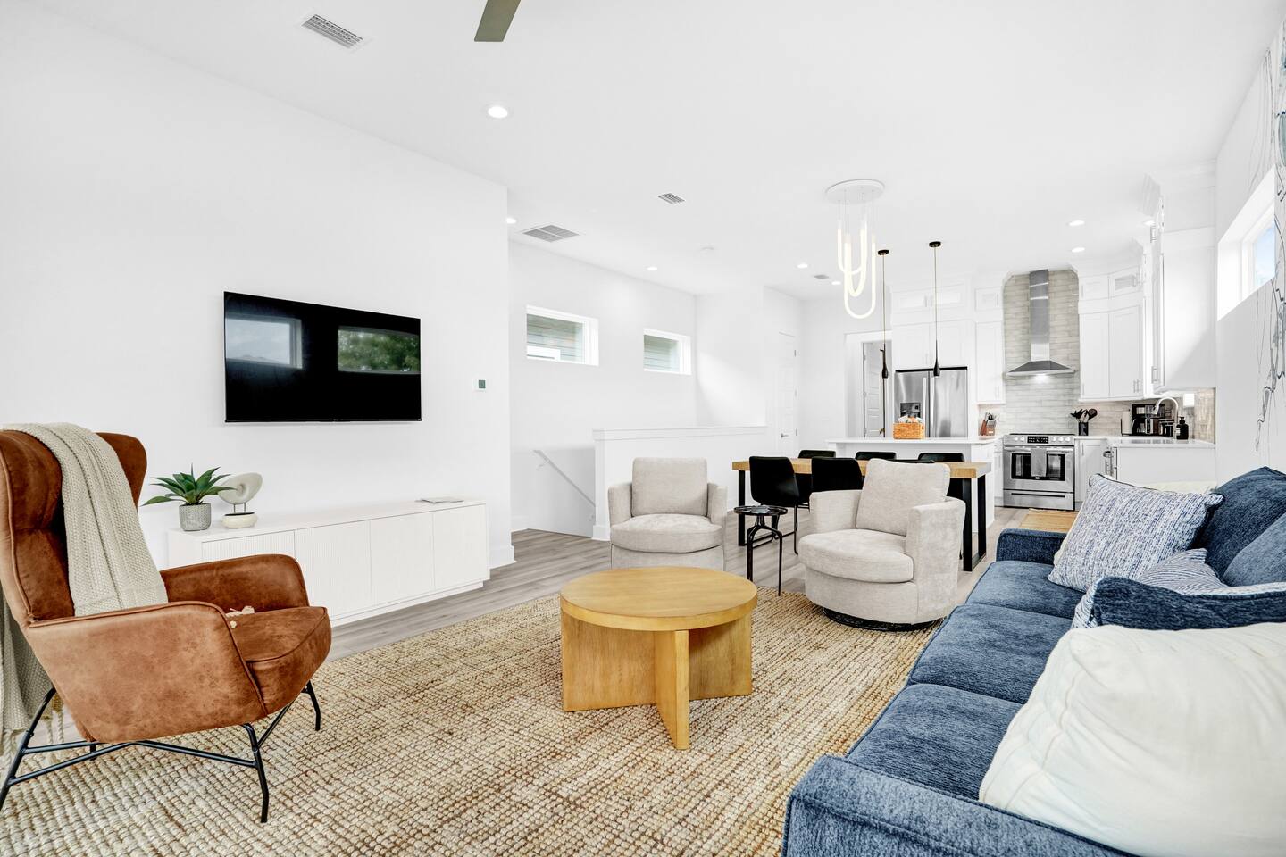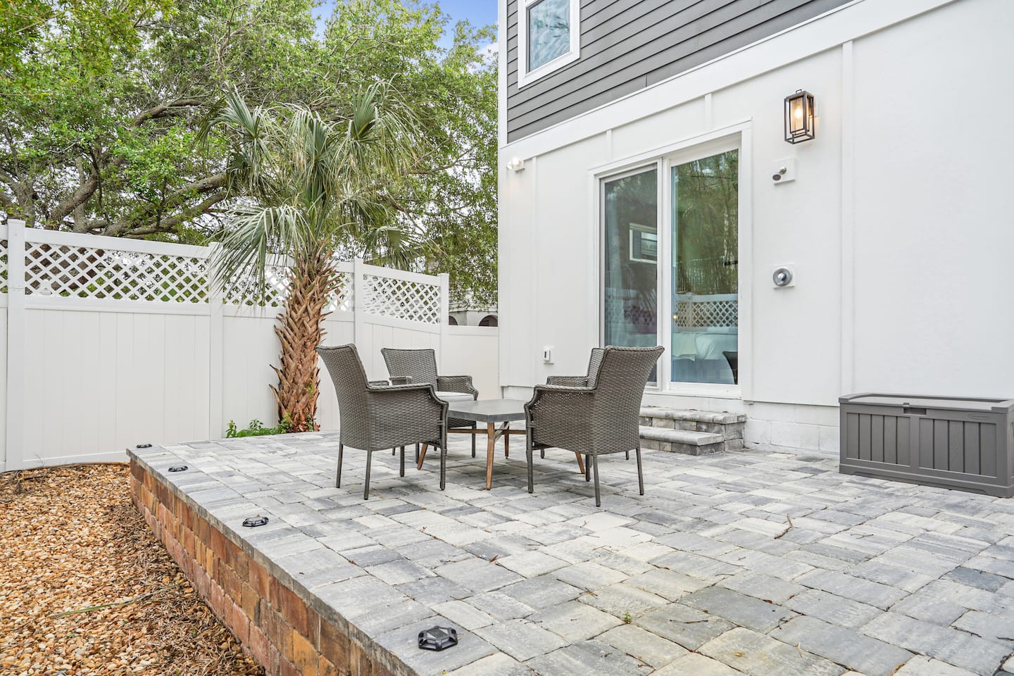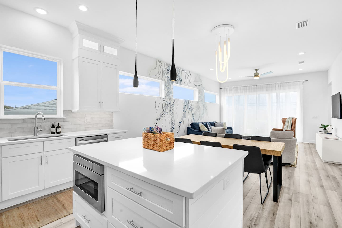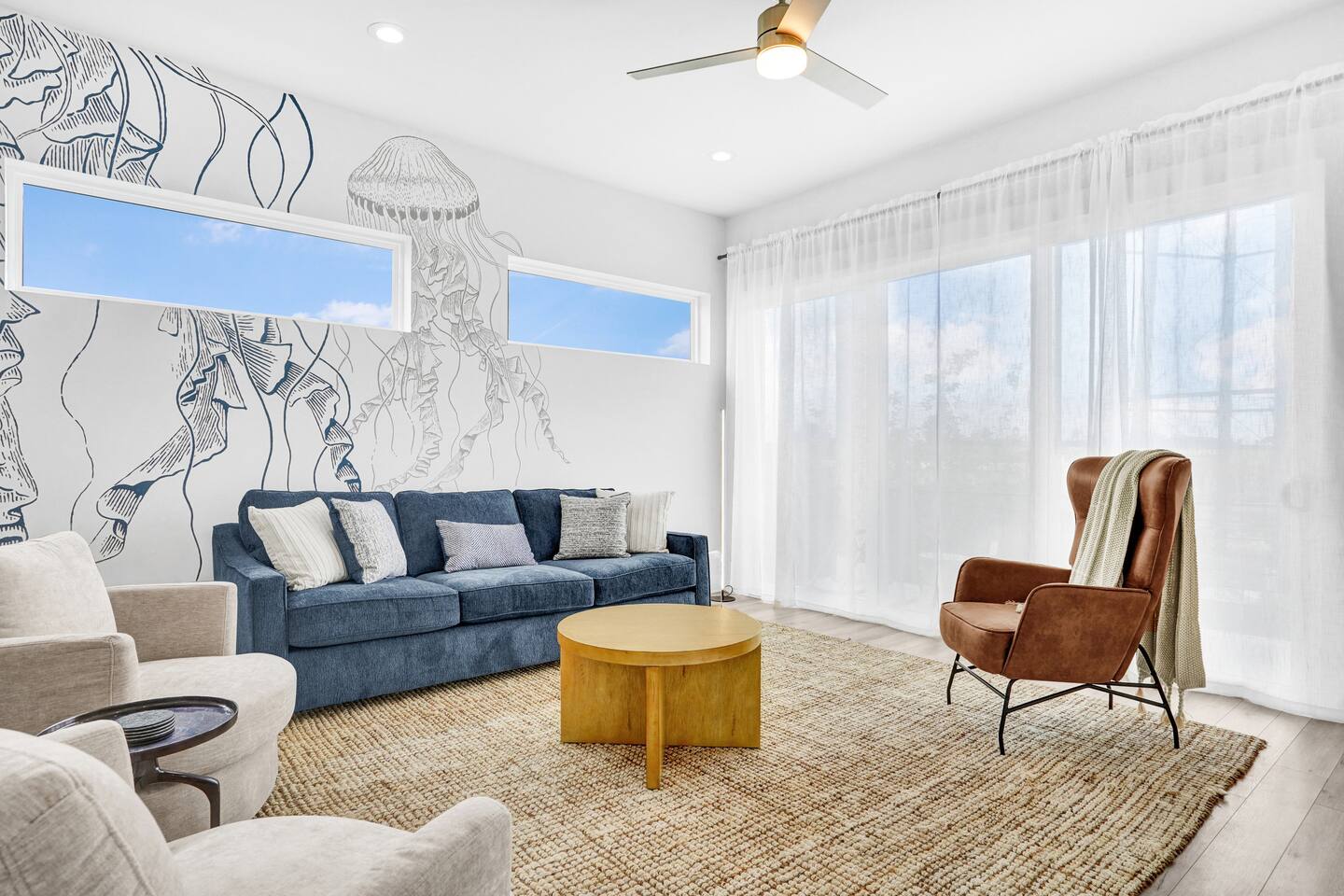 This four-bedroom beach house is great for families or friend groups seeking a comfy vacation spot. It features a big living room for hanging out after beach days and a well-equipped kitchen for cooking meals. Enjoy dining indoors or on the patio.