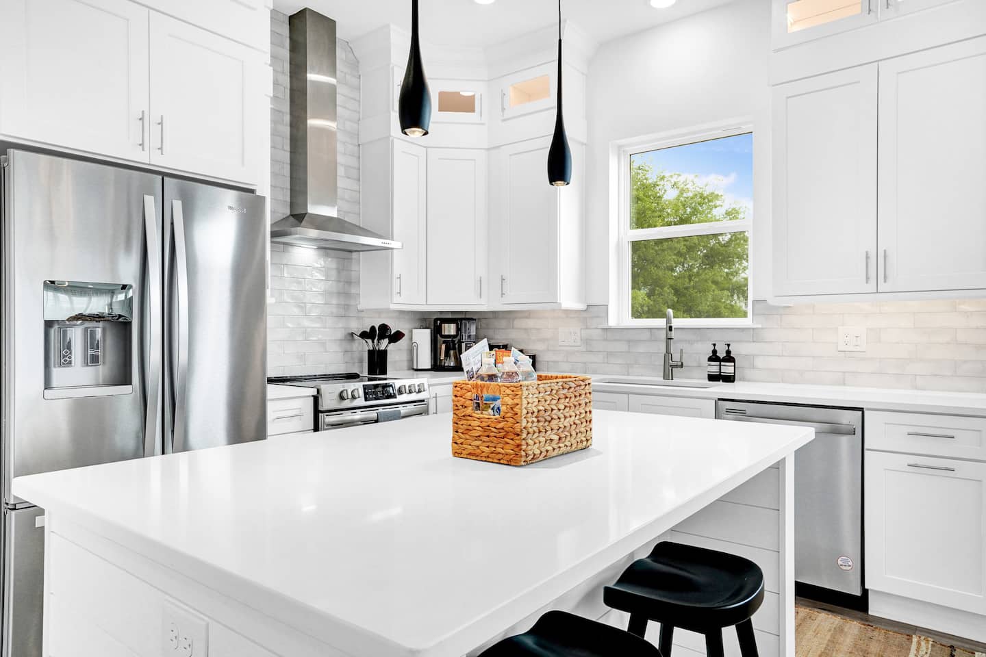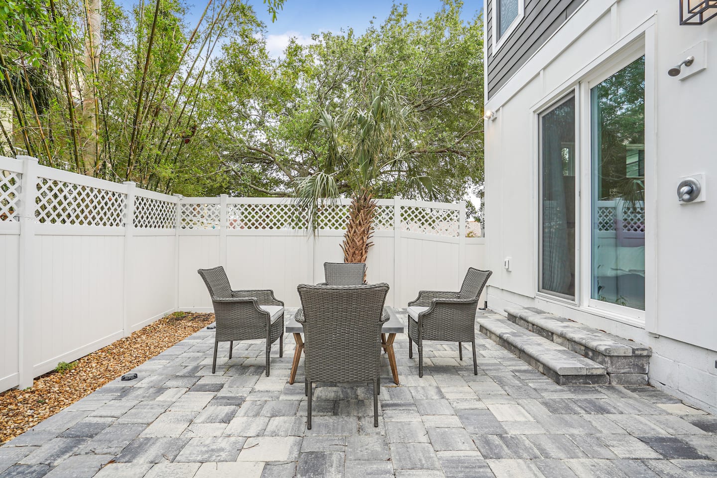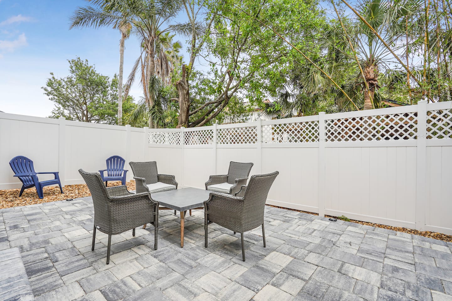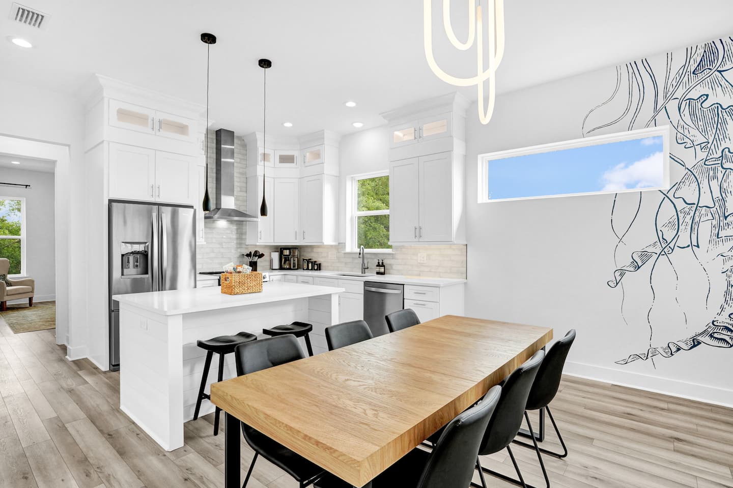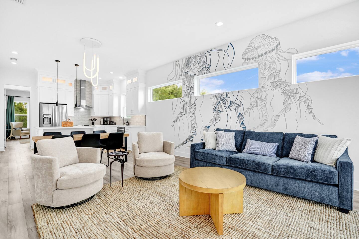 This four-bedroom beach house is great for families or friend groups seeking a comfy vacation spot. It features a big living room for hanging out after beach days and a well-equipped kitchen for cooking meals. Enjoy dining indoors or on the patio.