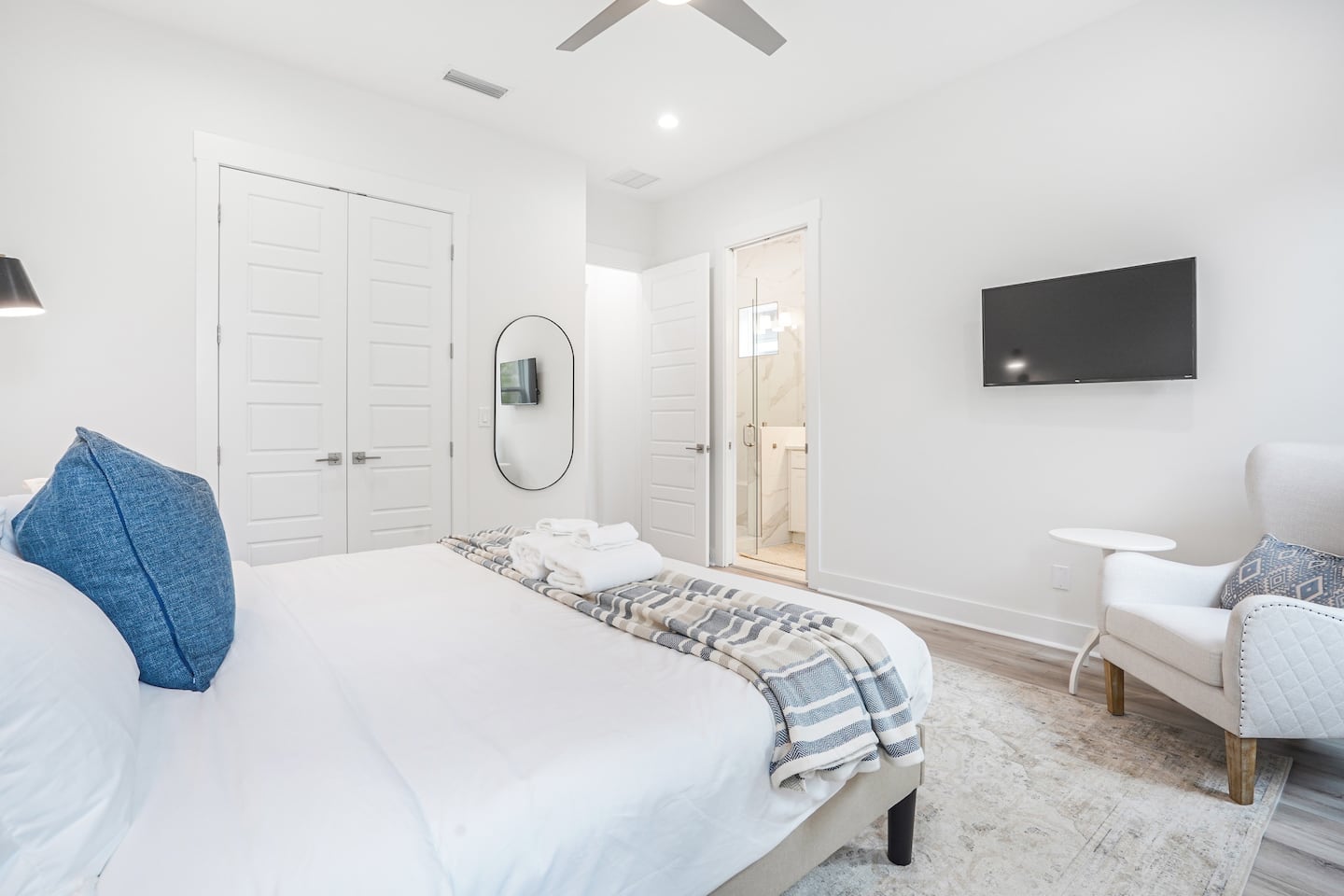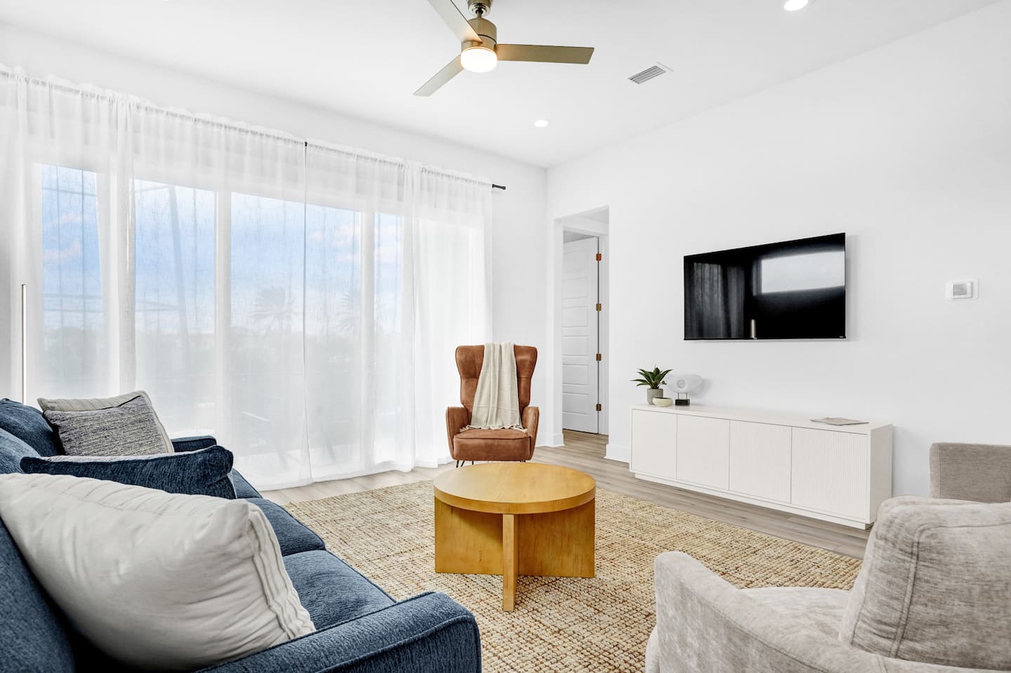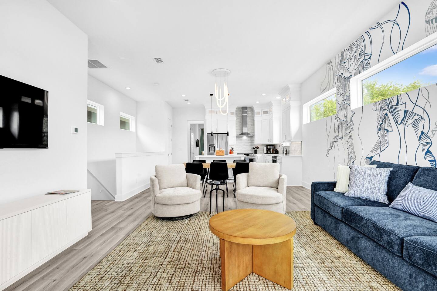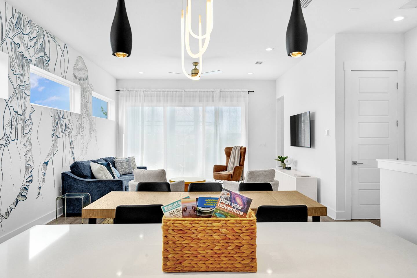 This four-bedroom beach house is great for families or friend groups seeking a comfy vacation spot. It features a big living room for hanging out after beach days and a well-equipped kitchen for cooking meals. Enjoy dining indoors or on the patio.