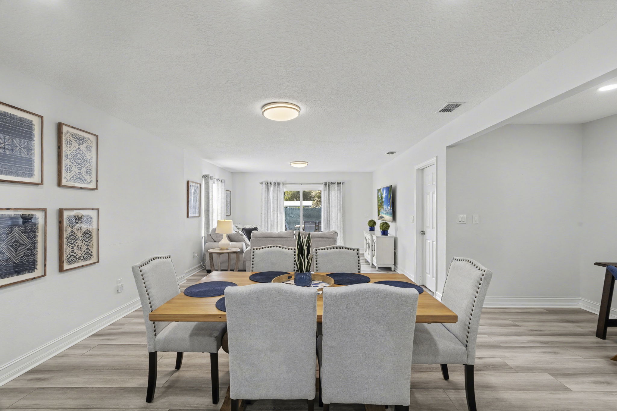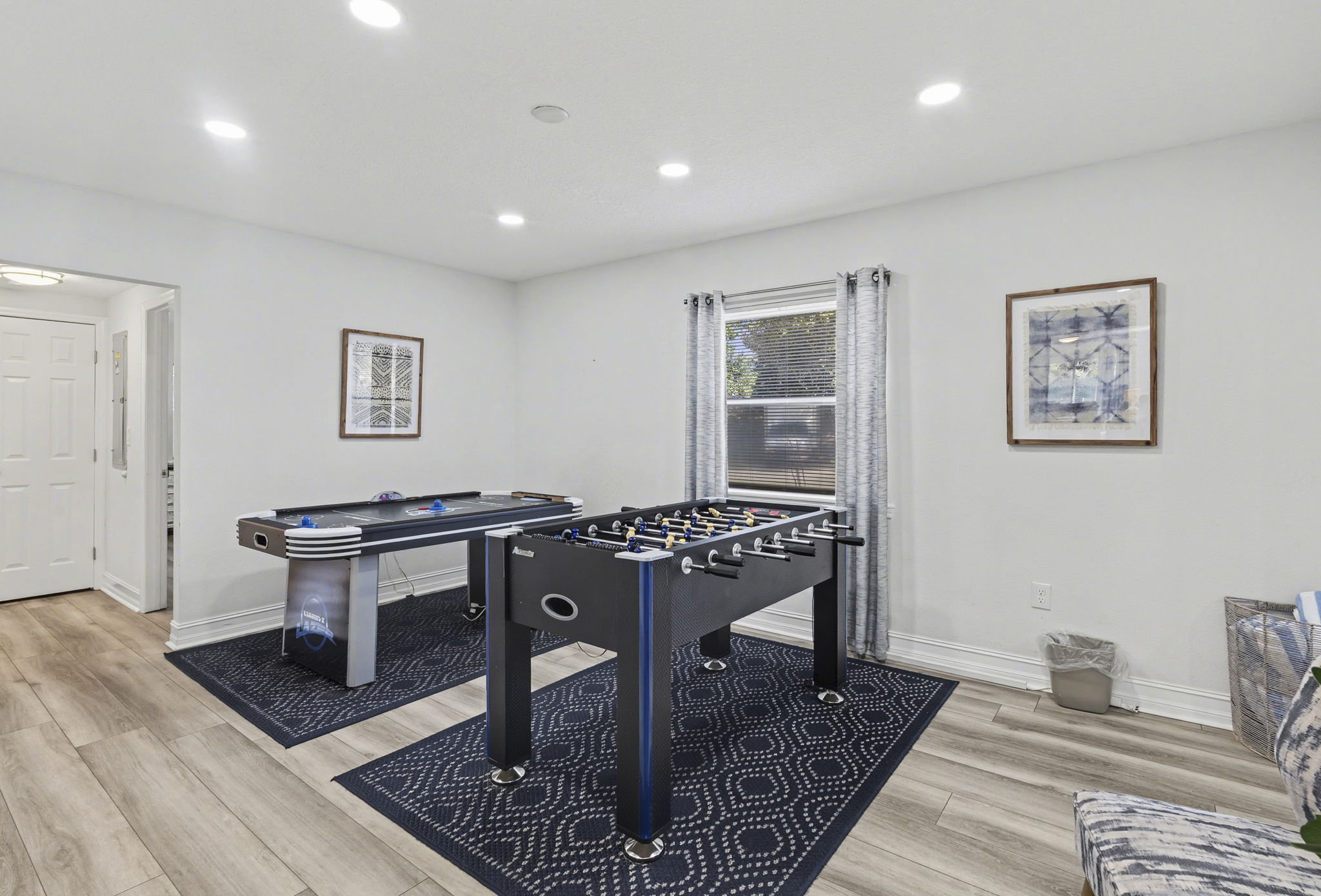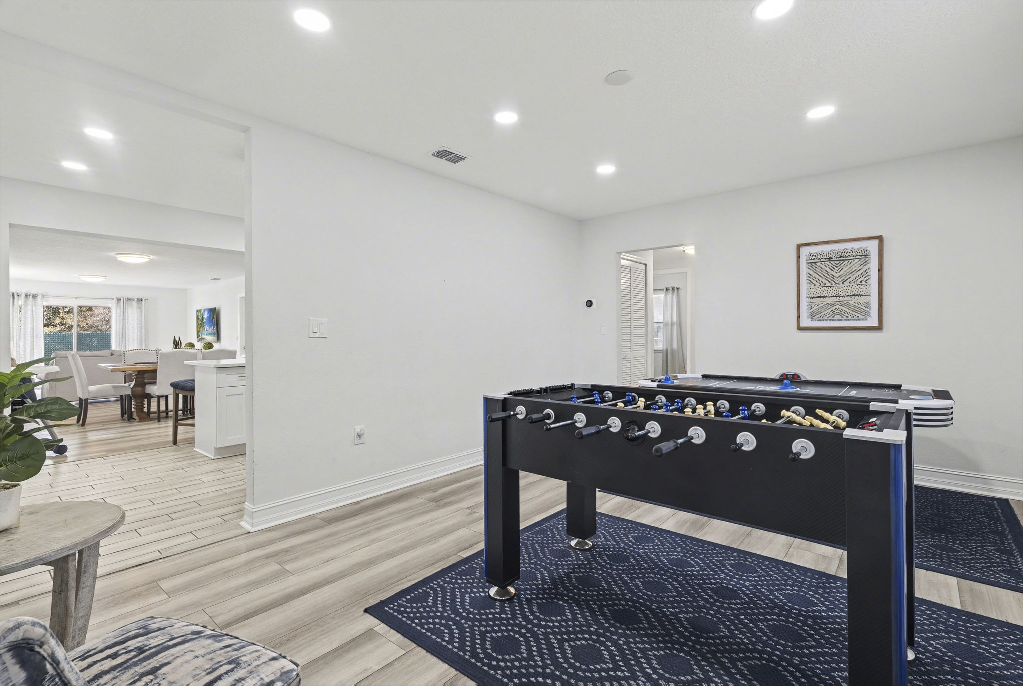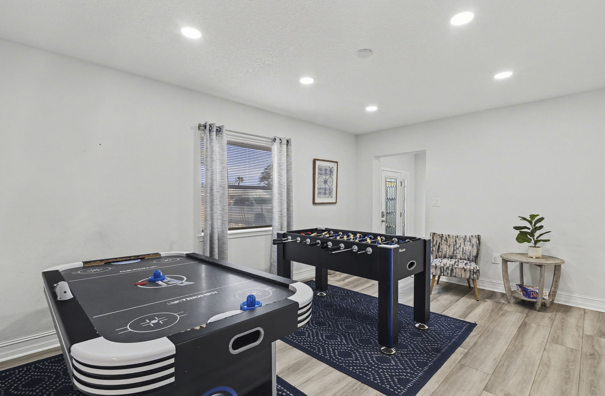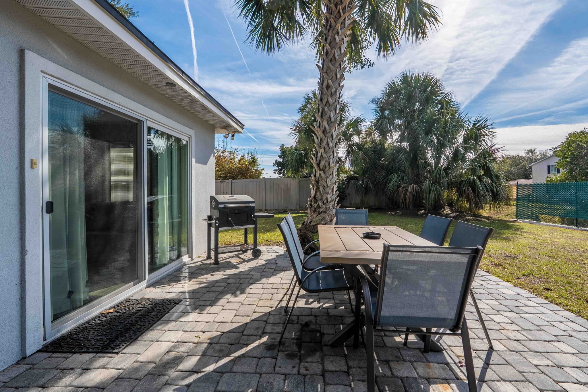 A spacious coastal getaway designed for comfort and connection. This 6-bedroom, 3-bath solid concrete home sleeps up to 14 guests and offers plenty of room to relax. Enjoy an open living area, a private master suite, and a fully equipped kitchen perfect for group meals. Step outside to a fenced backyard with a fire pit, grill, and seating. Walk to the beach, parks, and shopping, then unwind with foosball, air hockey, or movie nights. The perfect blend of space, location, and beachside charm.