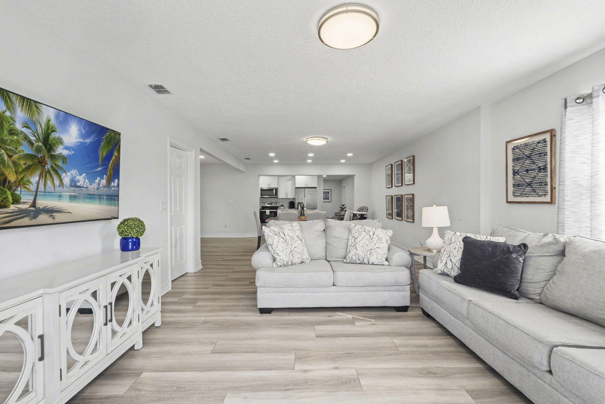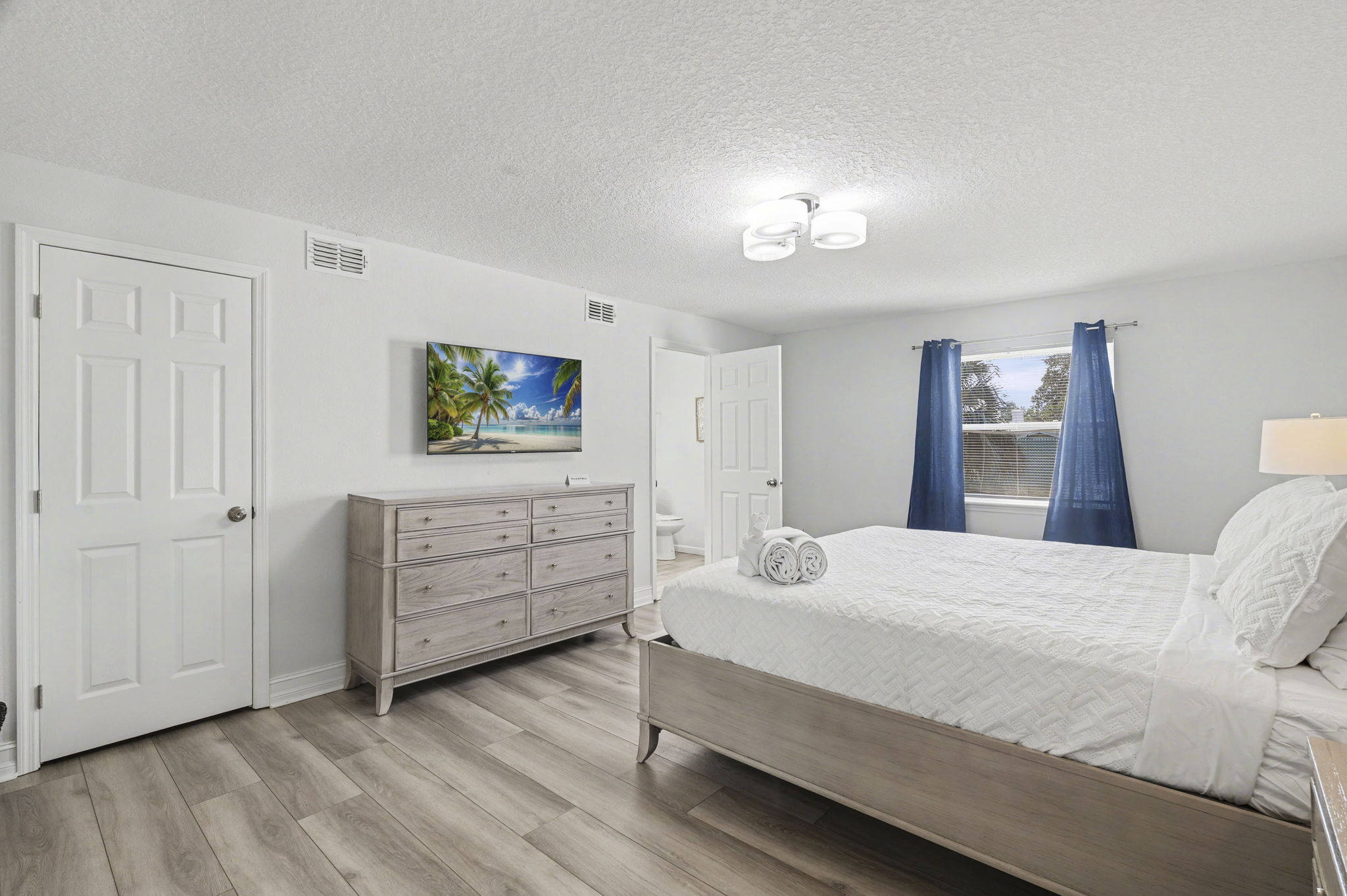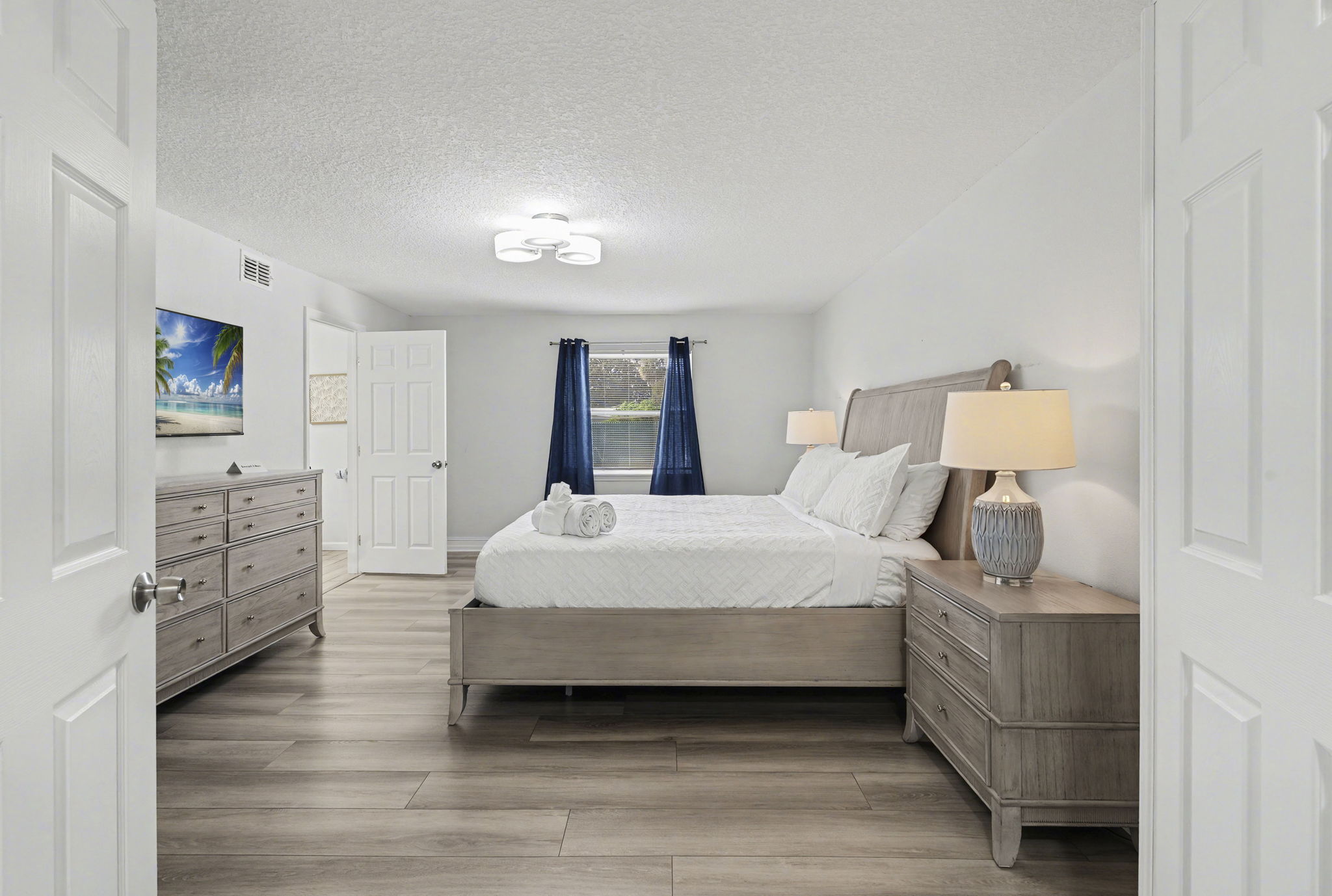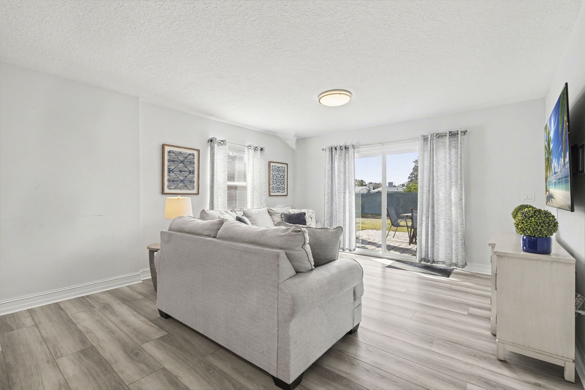 A spacious coastal getaway designed for comfort and connection. This 6-bedroom, 3-bath solid concrete home sleeps up to 14 guests and offers plenty of room to relax. Enjoy an open living area, a private master suite, and a fully equipped kitchen perfect for group meals. Step outside to a fenced backyard with a fire pit, grill, and seating. Walk to the beach, parks, and shopping, then unwind with foosball, air hockey, or movie nights. The perfect blend of space, location, and beachside charm.