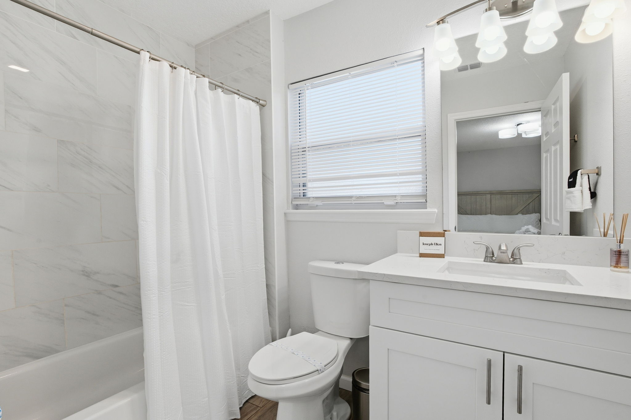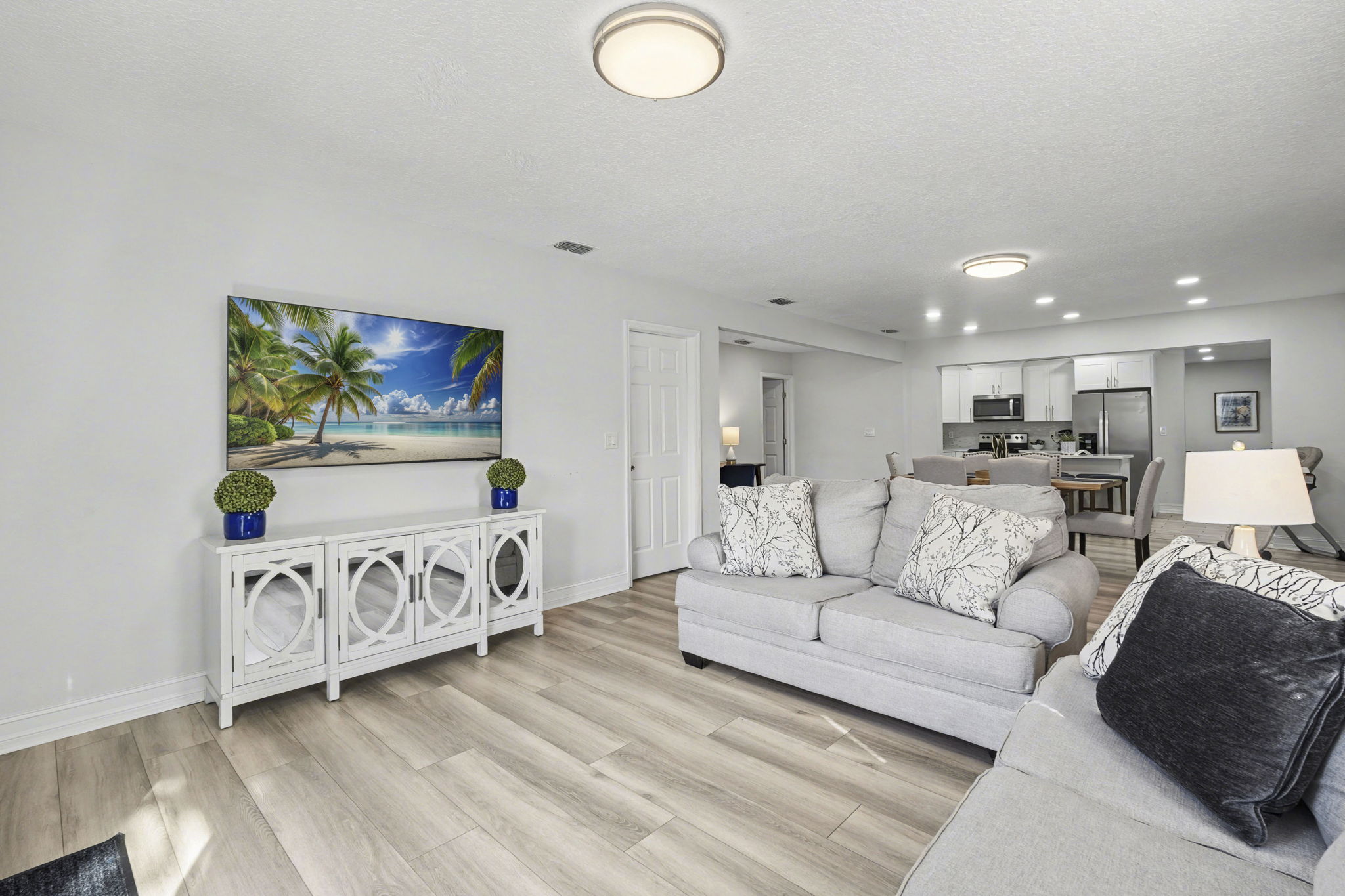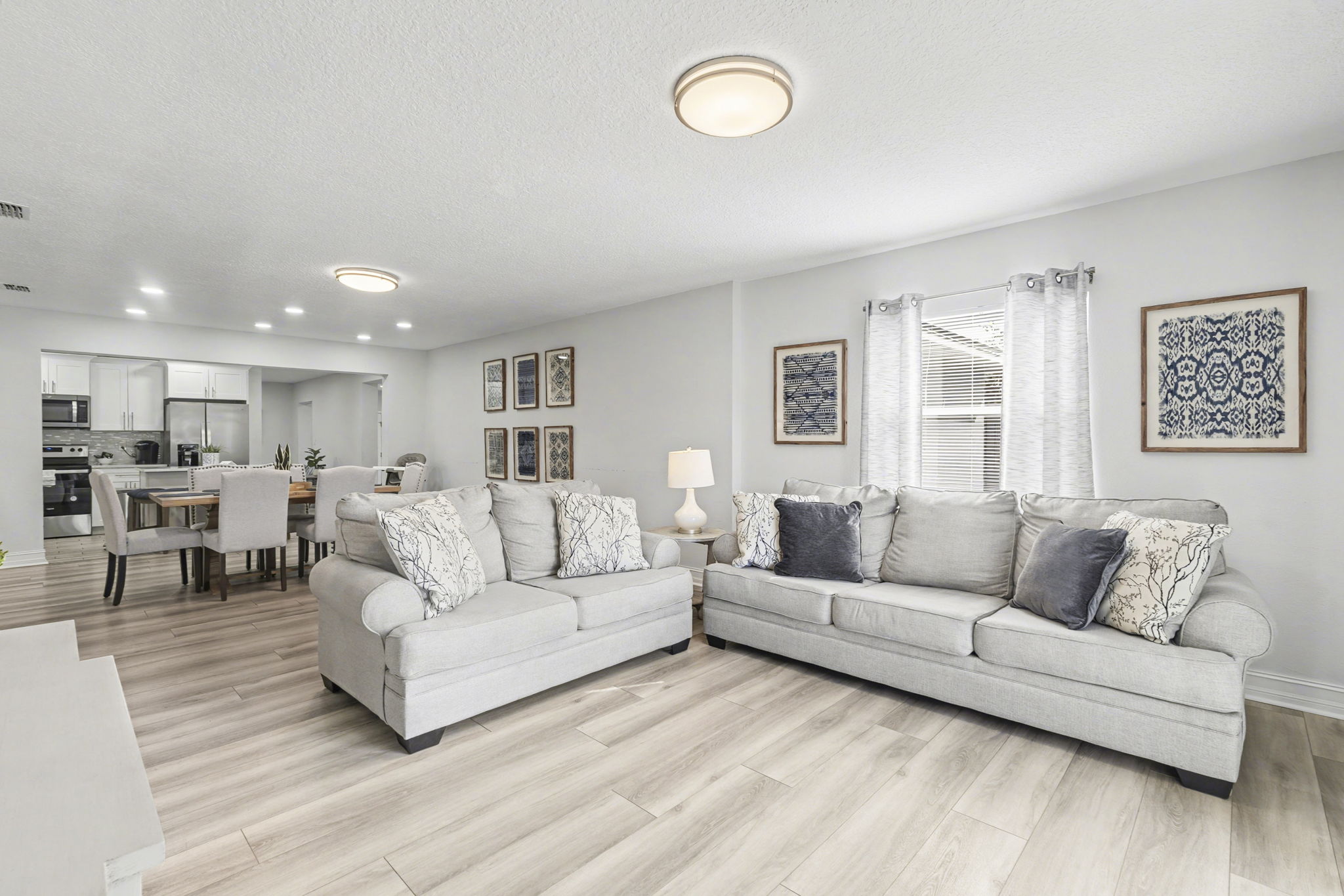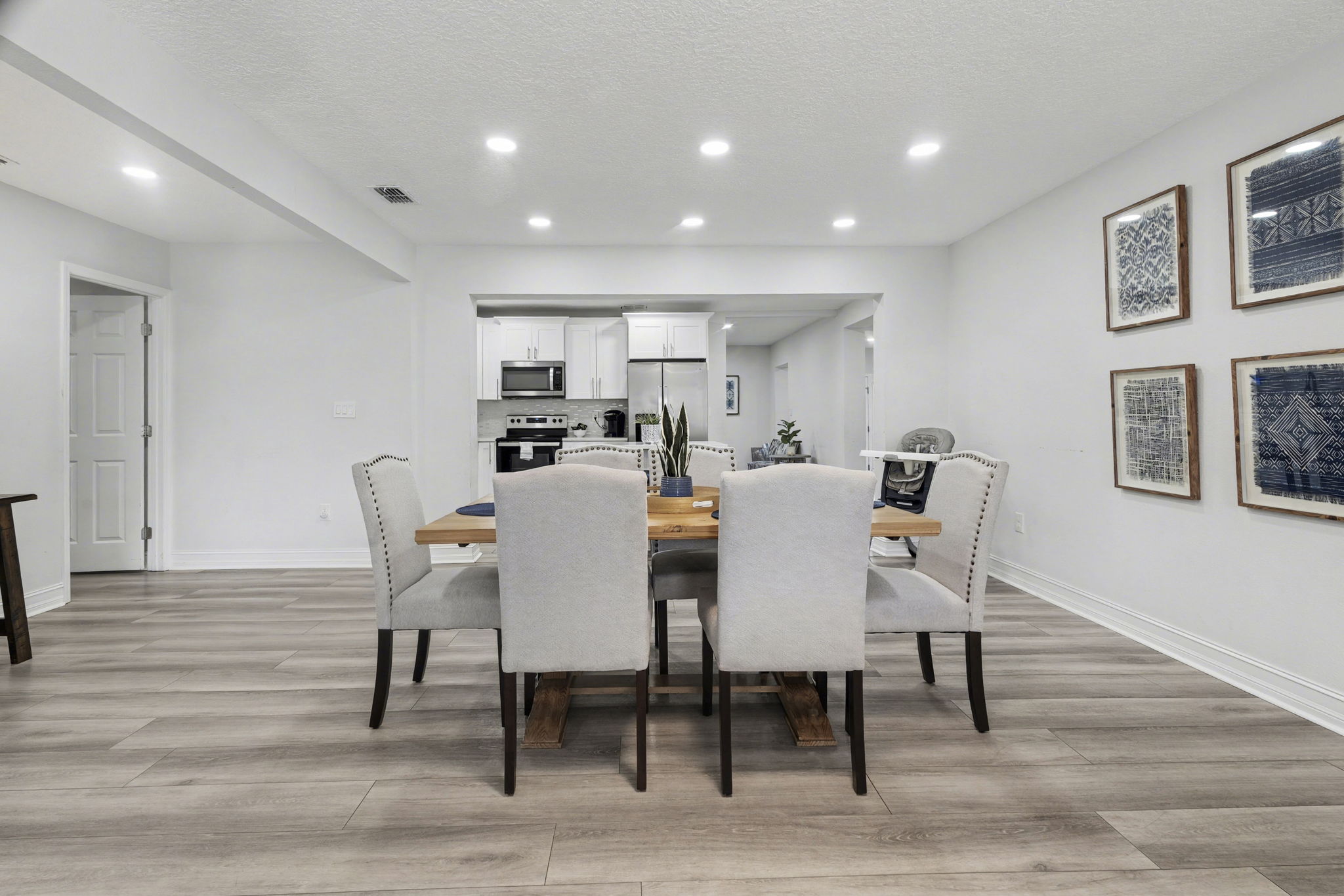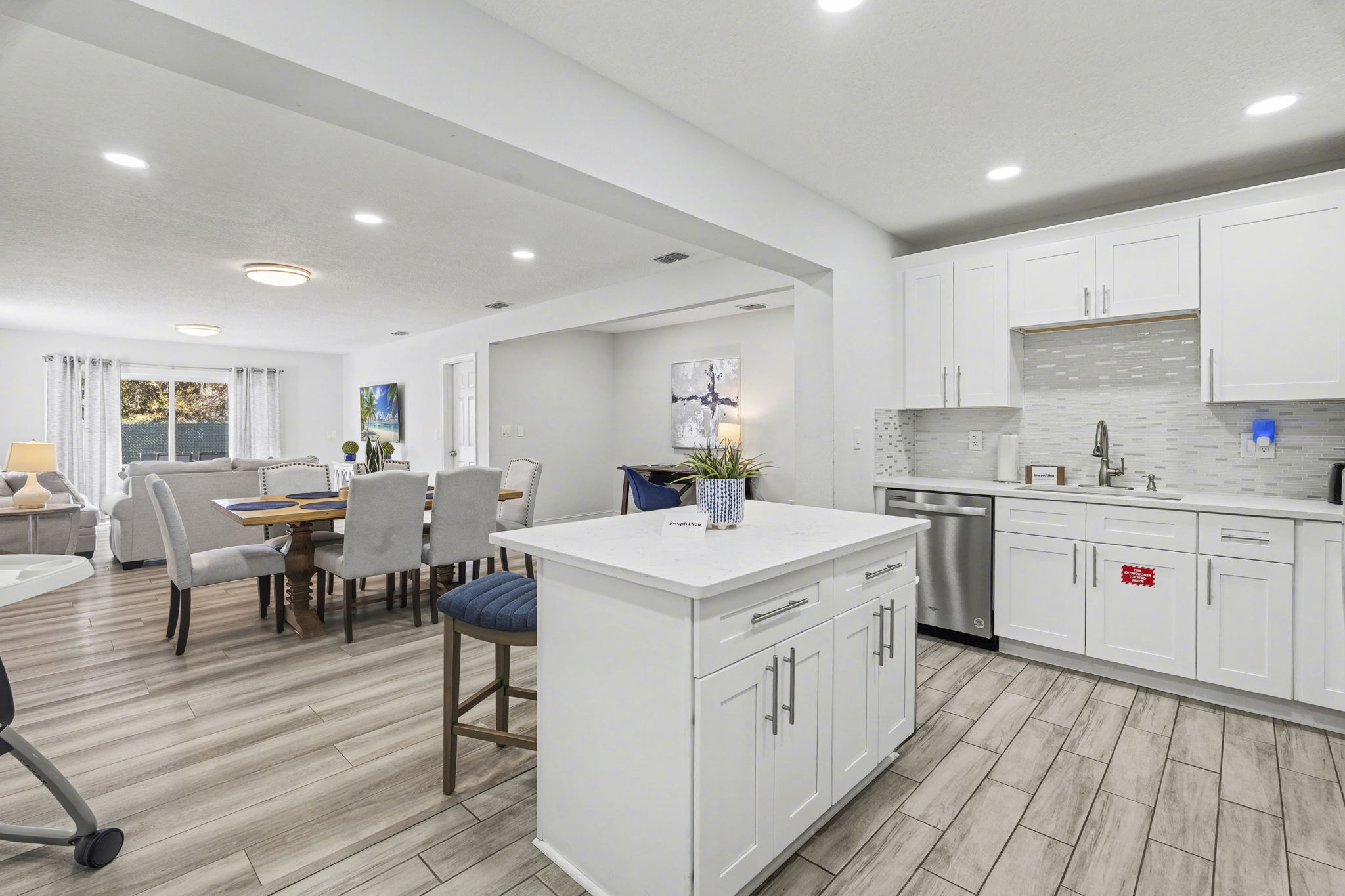A spacious coastal getaway designed for comfort and connection. This 6-bedroom, 3-bath solid concrete home sleeps up to 14 guests and offers plenty of room to relax. Enjoy an open living area, a private master suite, and a fully equipped kitchen perfect for group meals. Step outside to a fenced backyard with a fire pit, grill, and seating. Walk to the beach, parks, and shopping, then unwind with foosball, air hockey, or movie nights. The perfect blend of space, location, and beachside charm.