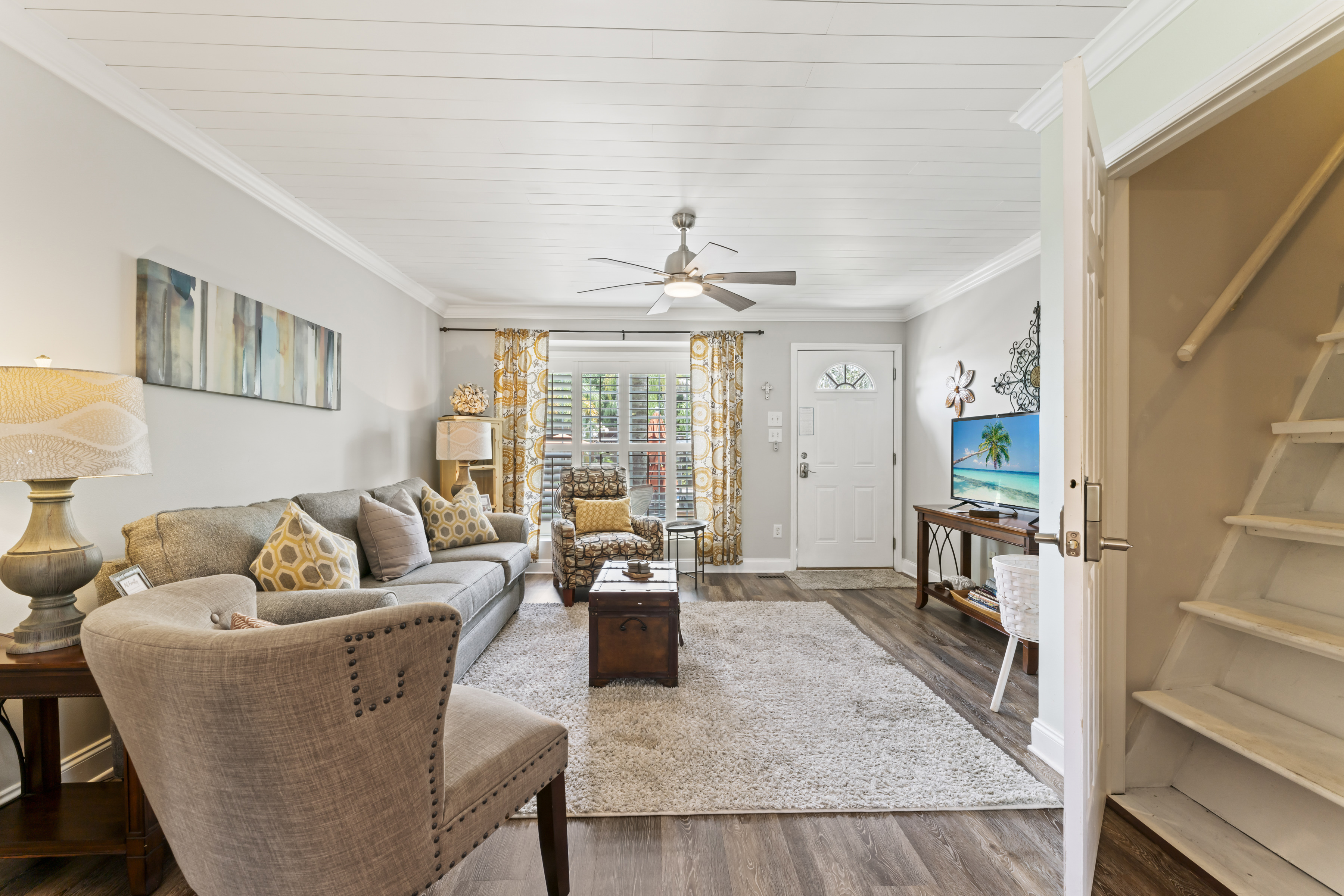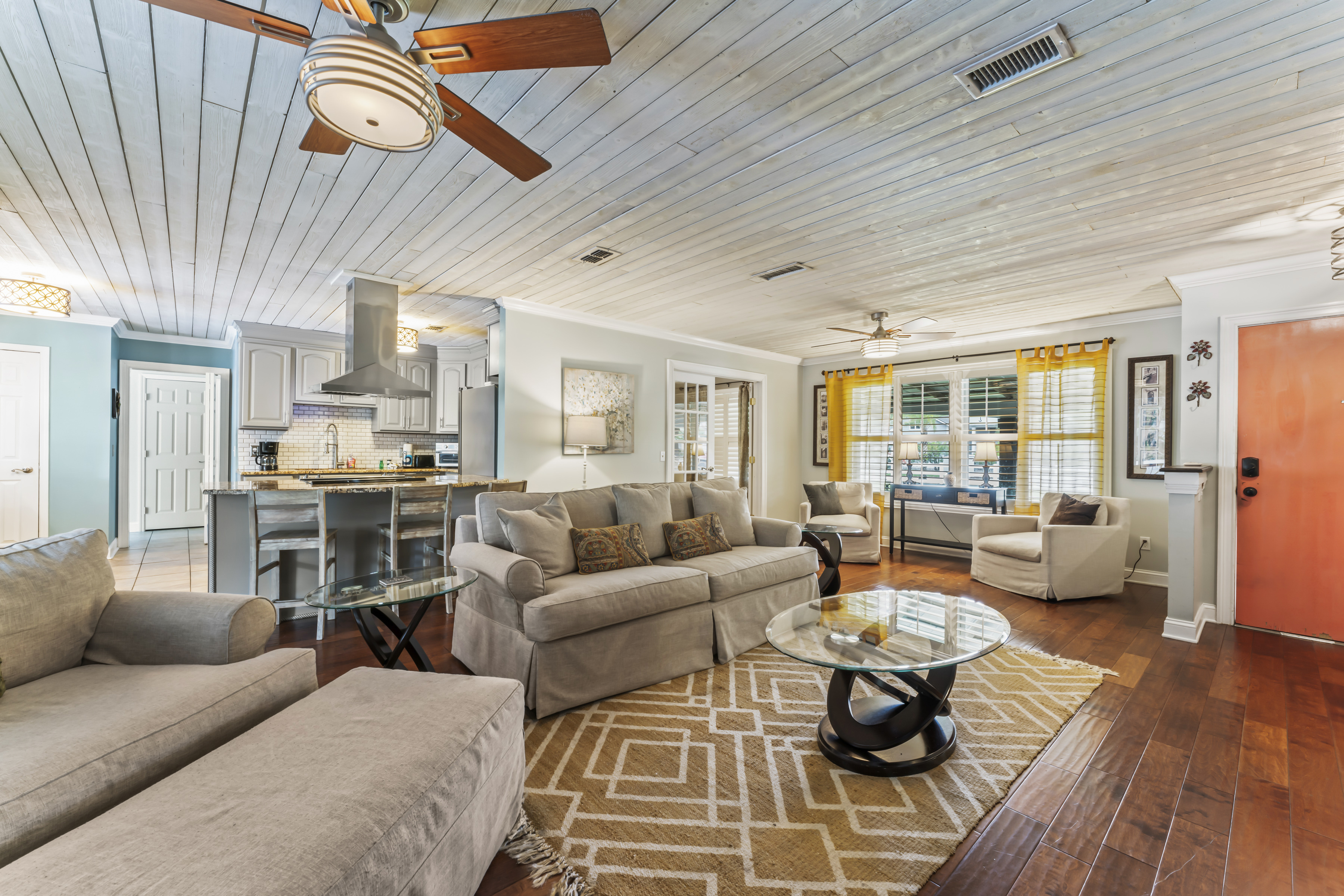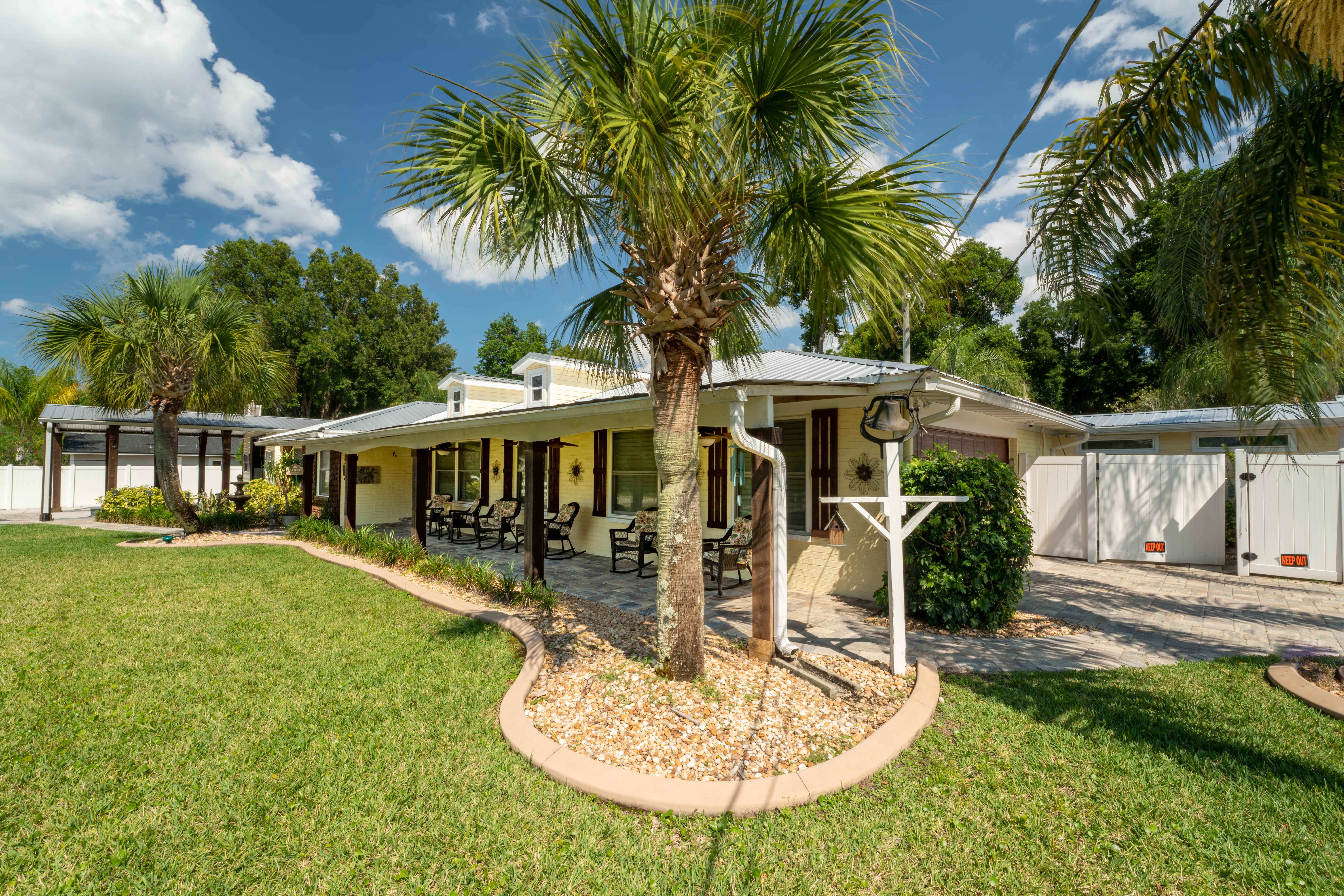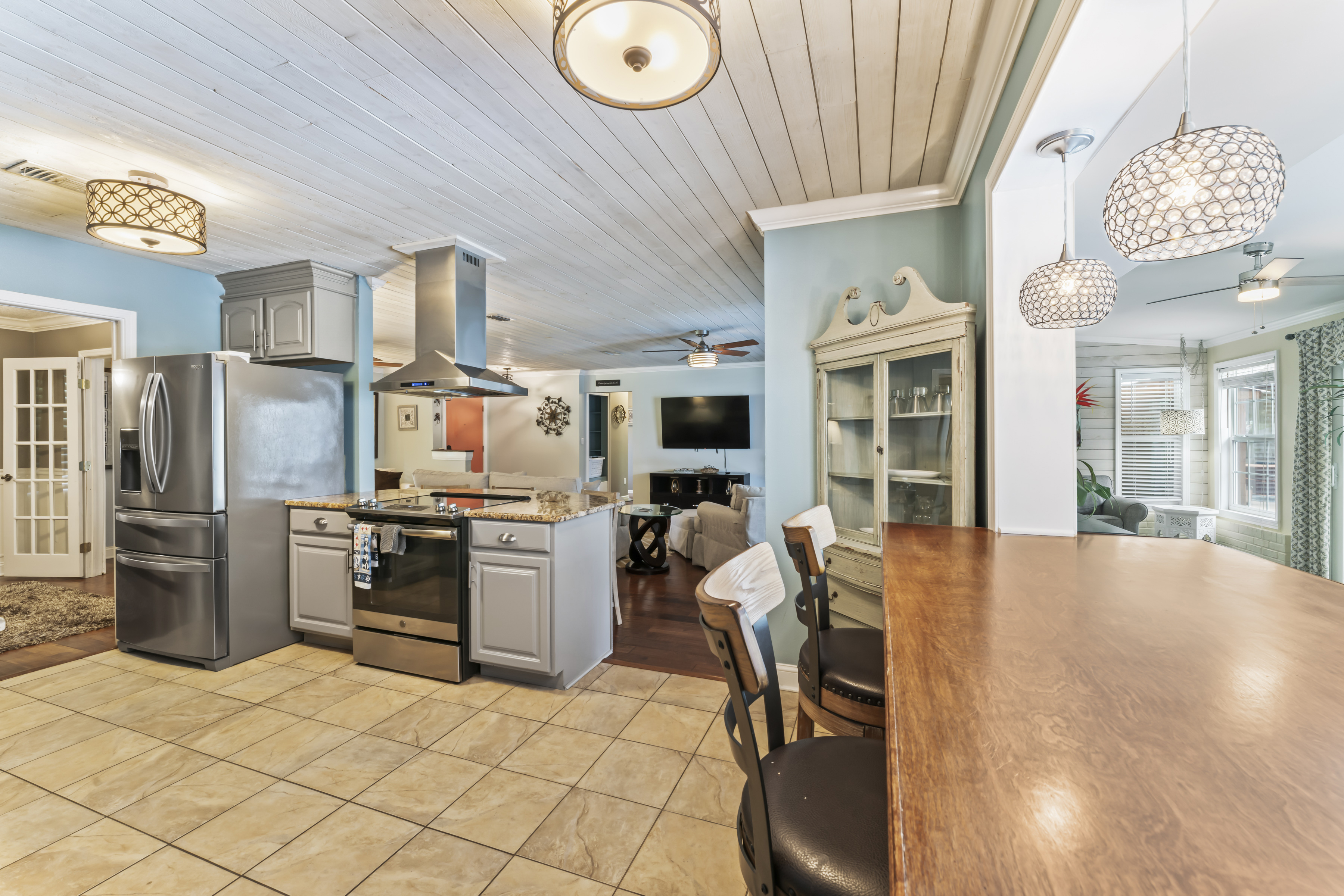 This beautiful, spacious 4 bedroom, 2 bath home has a fully furnished gourmet kitchen with all new appliances and granite countertops, two king size primary rooms, and 2 queen size rooms, and an additional sofa sleeper. There are several separate seating areas, breakfast bar and dining table that seats 8. Catch up on your favorite shows on a 65” smart (Roku) 4K TV by logging onto your personal Netflix, Amazon or any other streaming services (we do not provide any content). Complete your day sitting in a rocking chair on the veranda, cooled by the ceiling fans, enjoying a drink while watching the sunset.