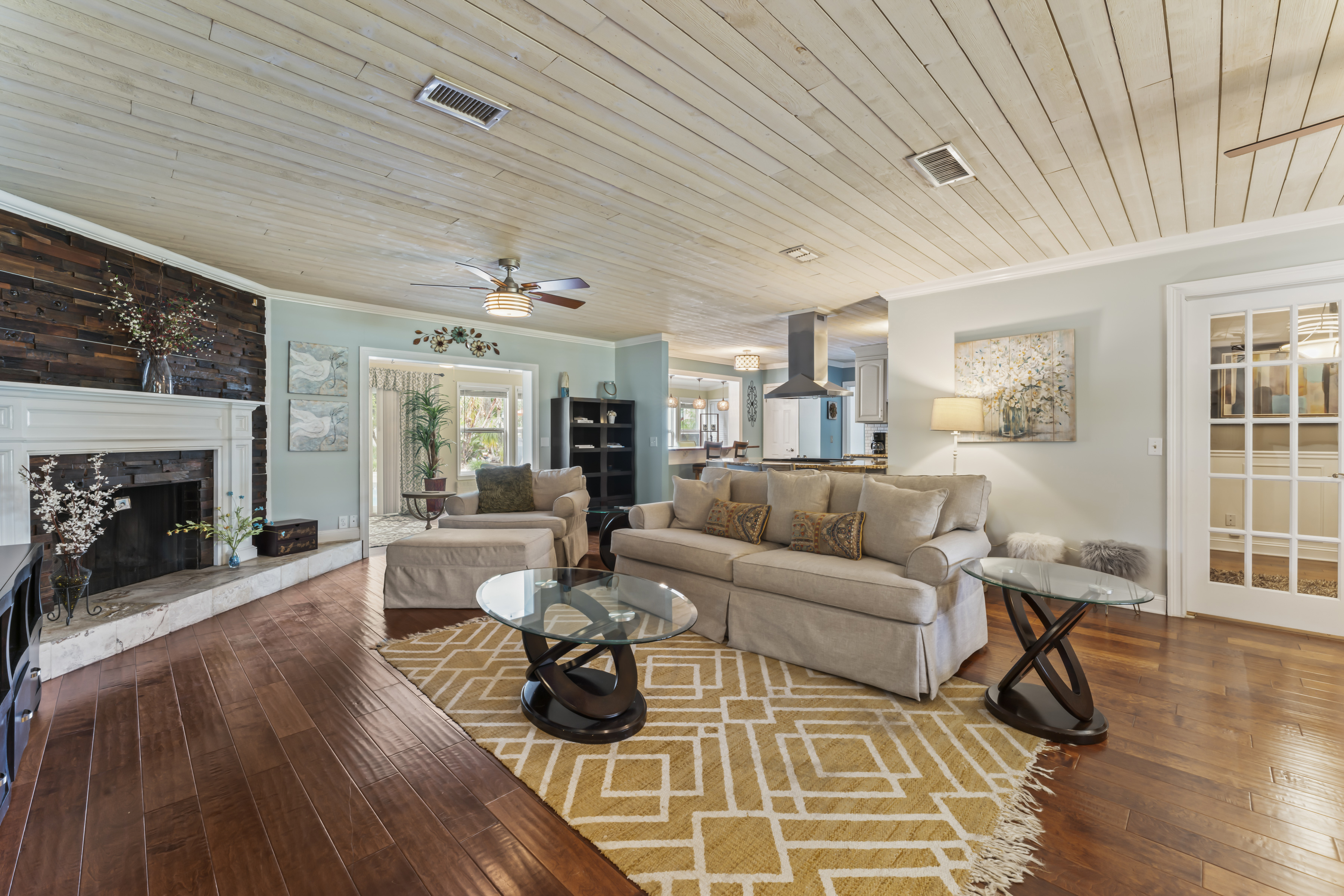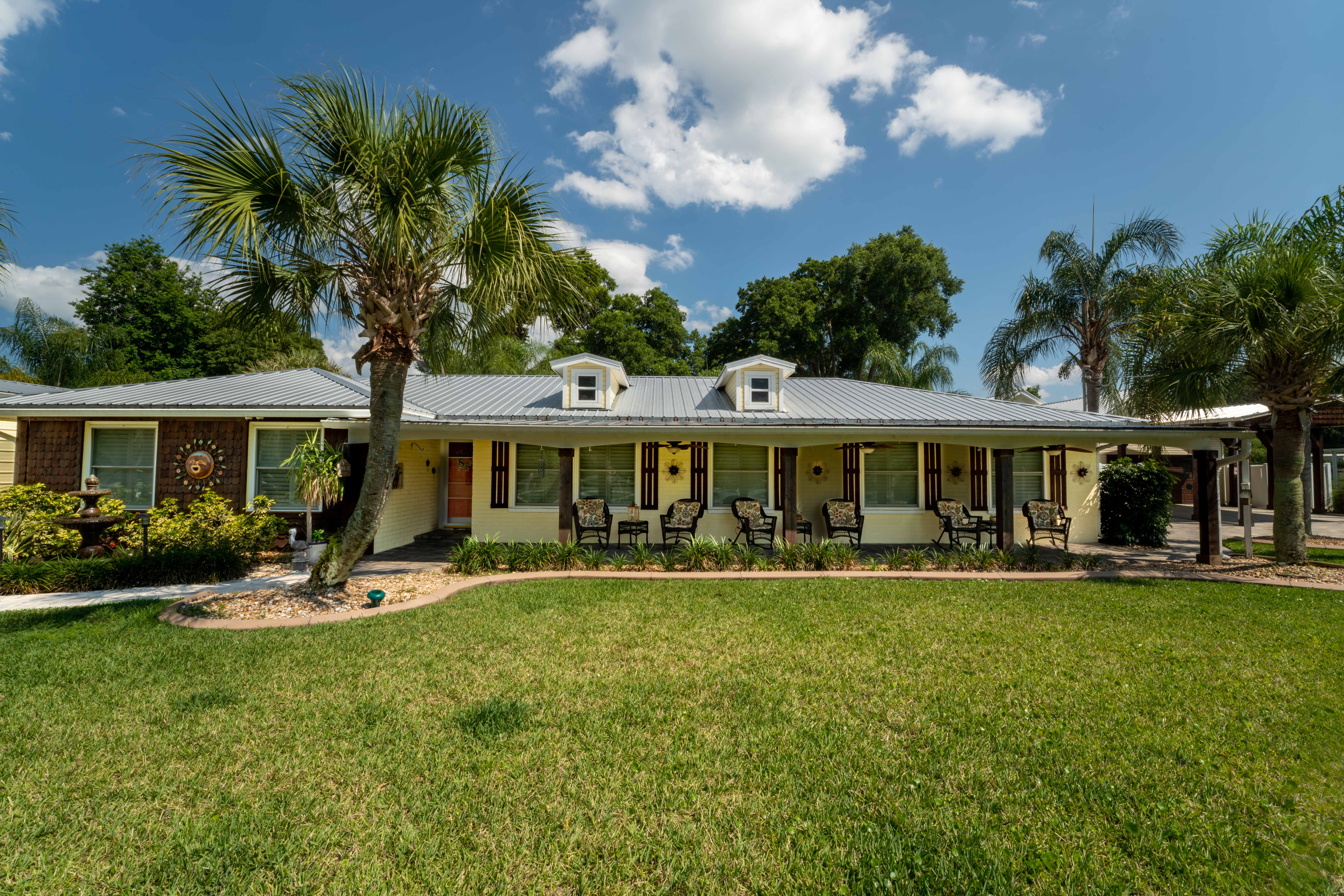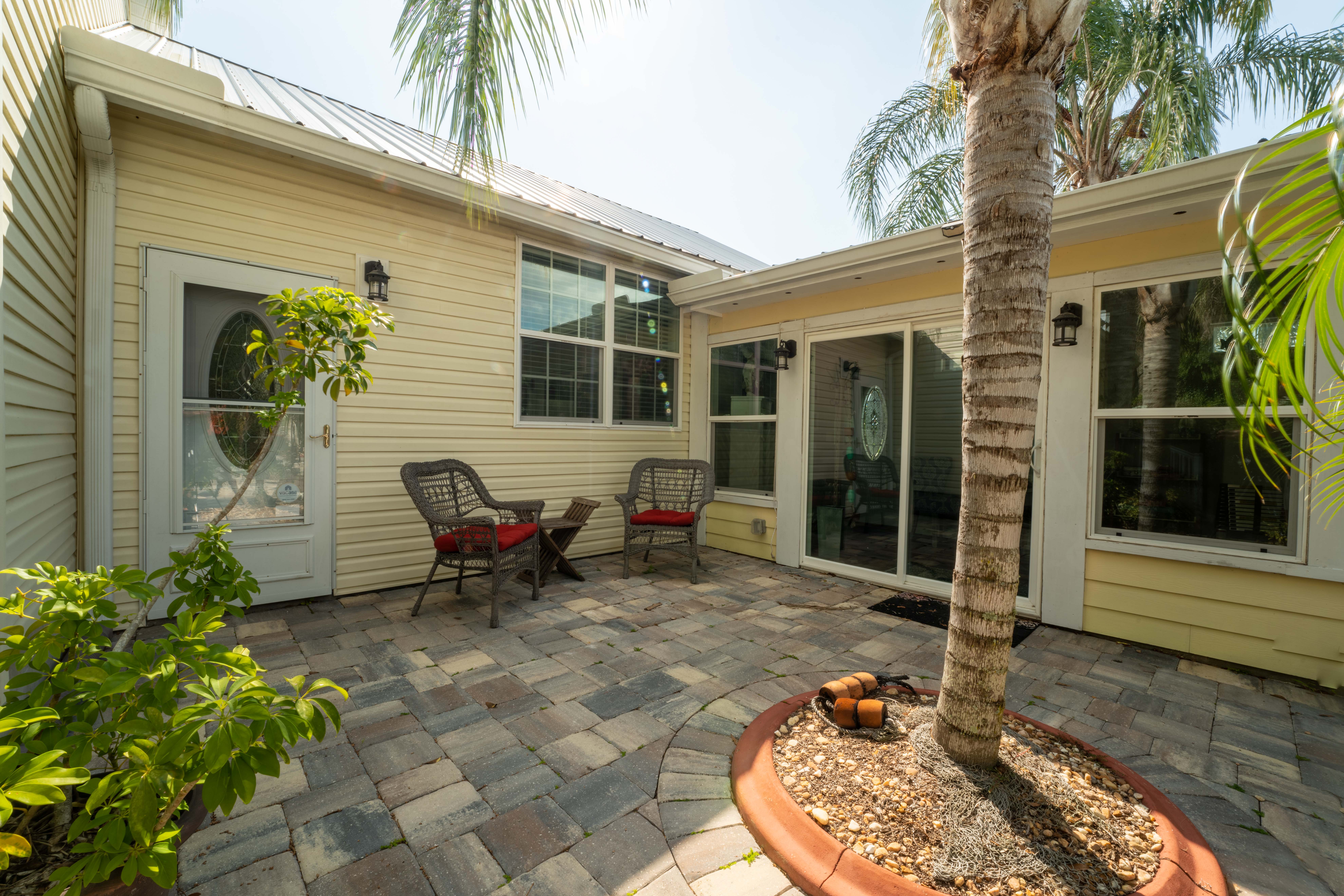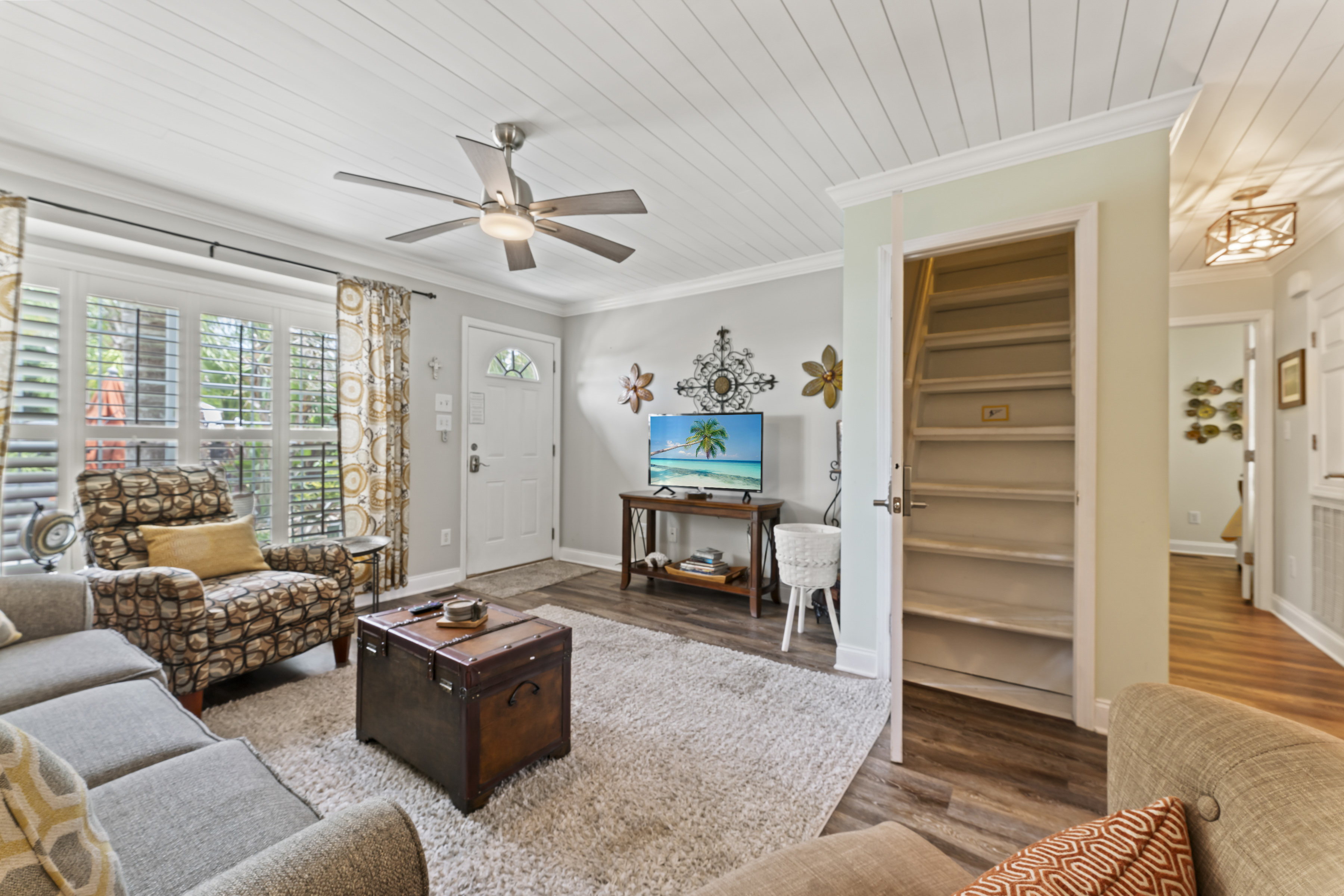 This beautiful, spacious 4 bedroom, 2 bath home has a fully furnished gourmet kitchen with all new appliances and granite countertops, two king size primary rooms, and 2 queen size rooms, and an additional sofa sleeper. There are several separate seating areas, breakfast bar and dining table that seats 8. Catch up on your favorite shows on a 65” smart (Roku) 4K TV by logging onto your personal Netflix, Amazon or any other streaming services (we do not provide any content). Complete your day sitting in a rocking chair on the veranda, cooled by the ceiling fans, enjoying a drink while watching the sunset.