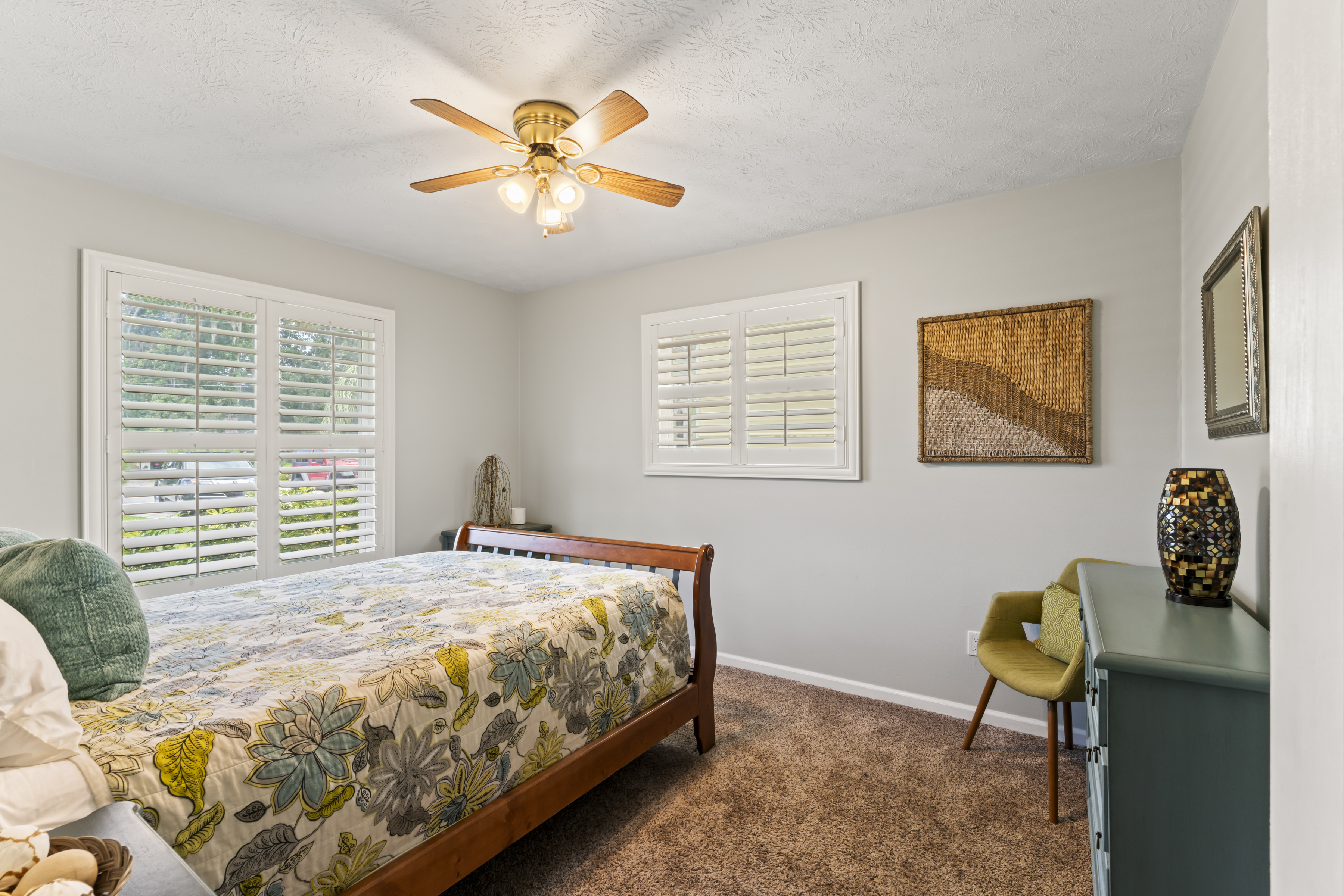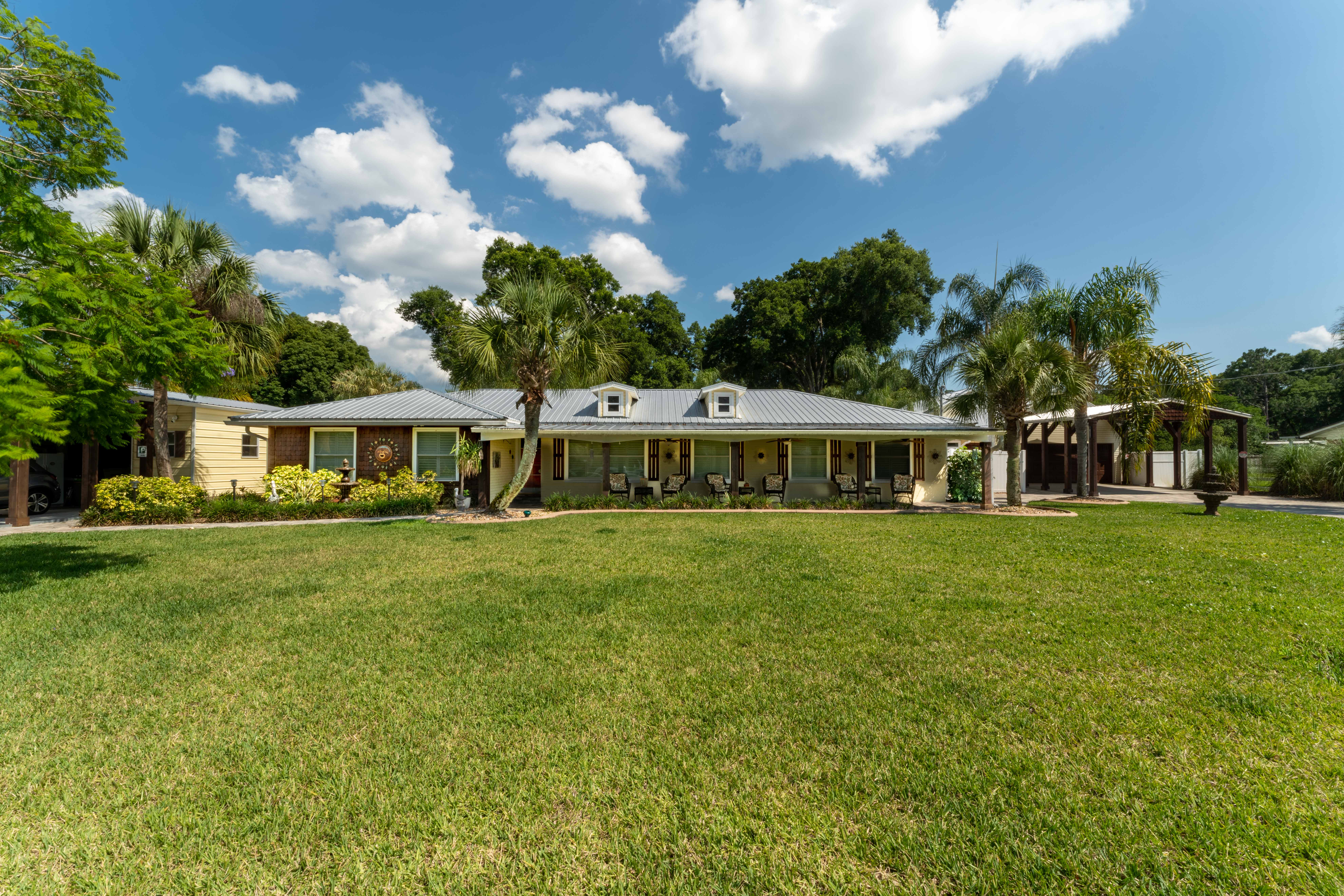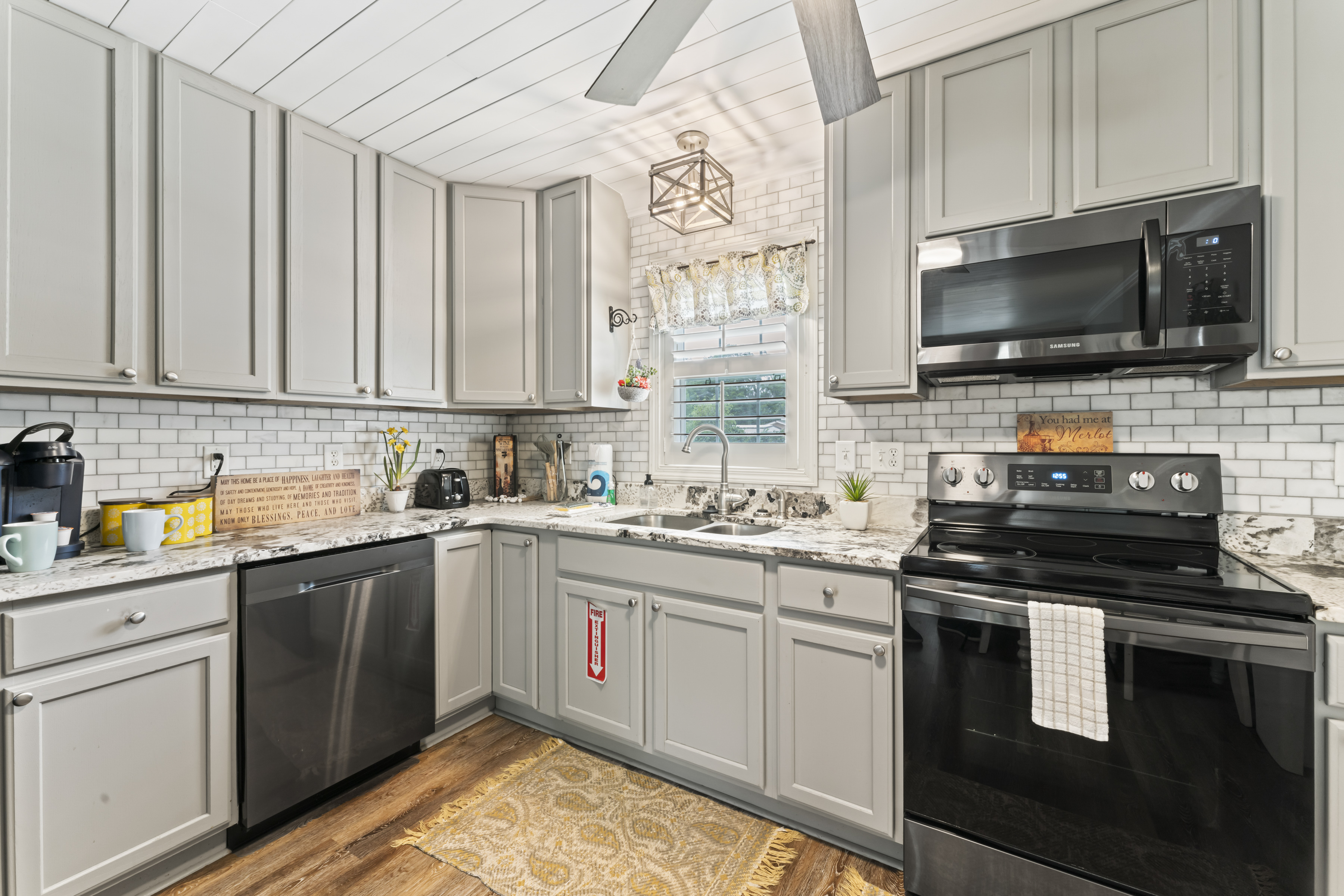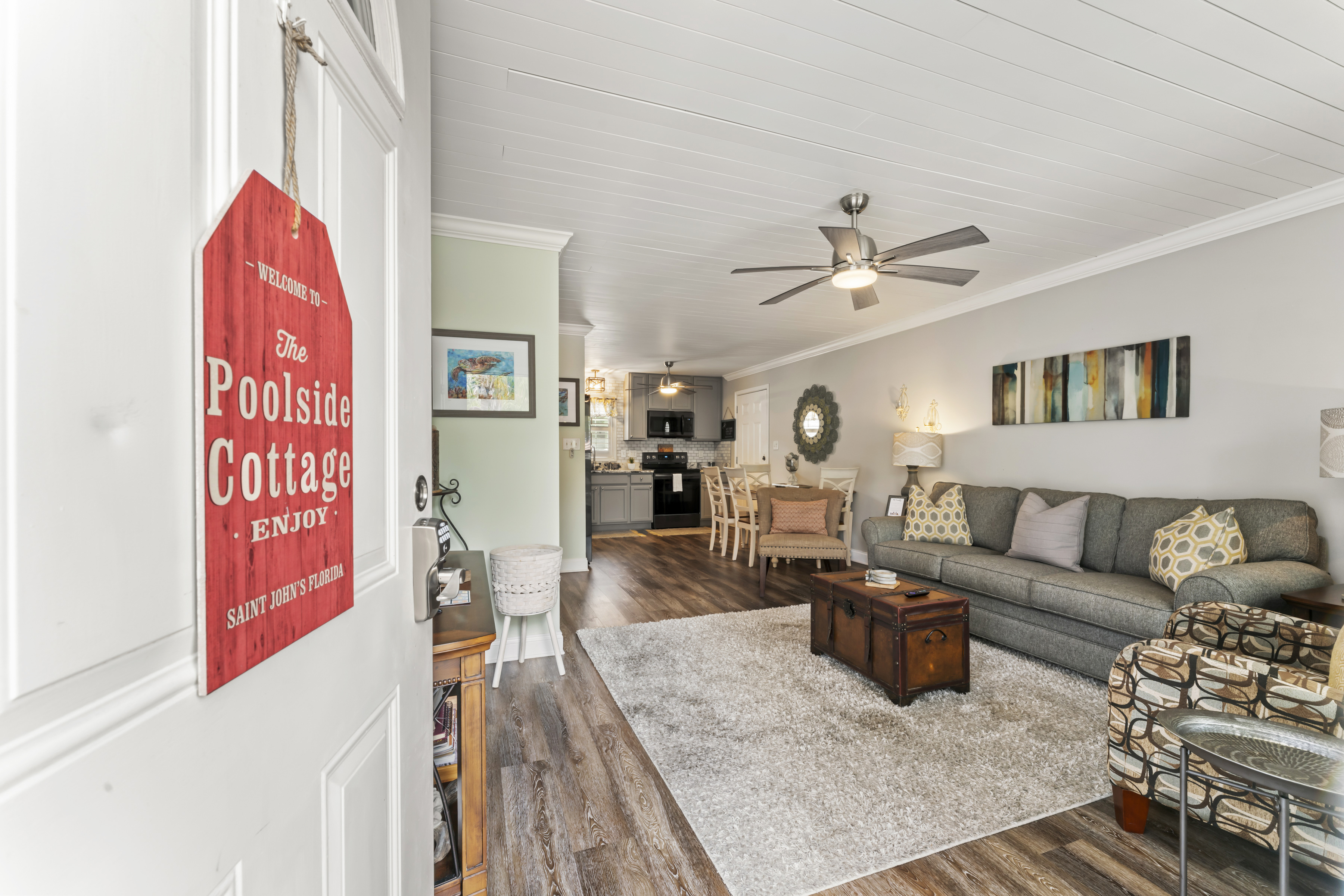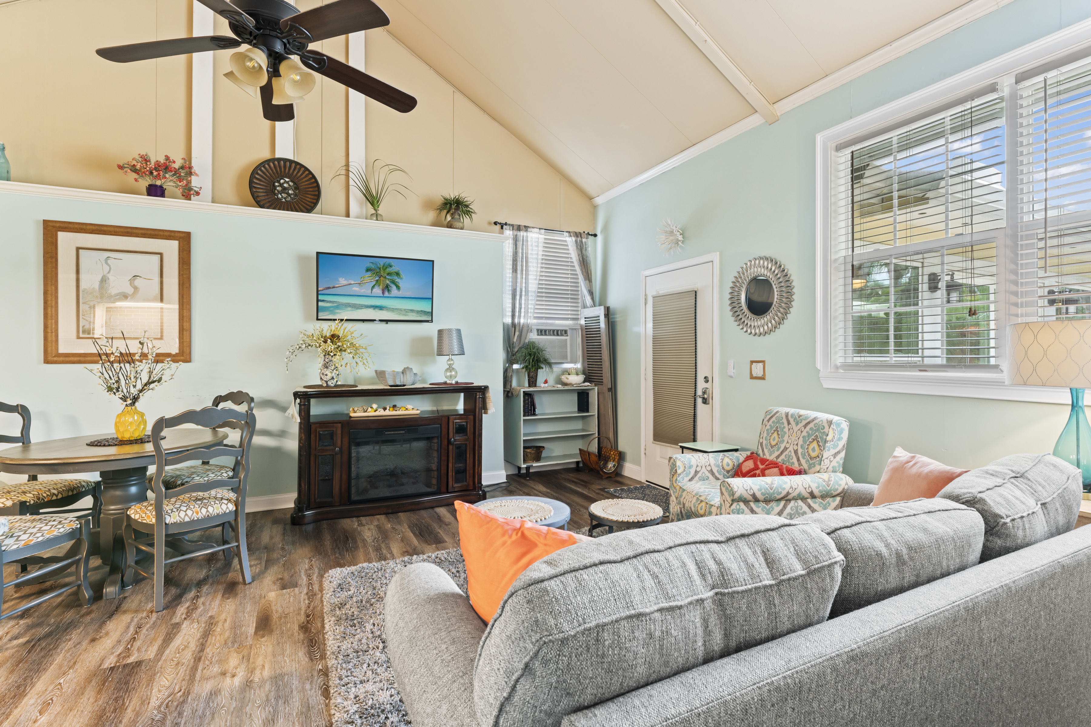 This beautiful, spacious 4 bedroom, 2 bath home has a fully furnished gourmet kitchen with all new appliances and granite countertops, two king size primary rooms, and 2 queen size rooms, and an additional sofa sleeper. There are several separate seating areas, breakfast bar and dining table that seats 8. Catch up on your favorite shows on a 65” smart (Roku) 4K TV by logging onto your personal Netflix, Amazon or any other streaming services (we do not provide any content). Complete your day sitting in a rocking chair on the veranda, cooled by the ceiling fans, enjoying a drink while watching the sunset.