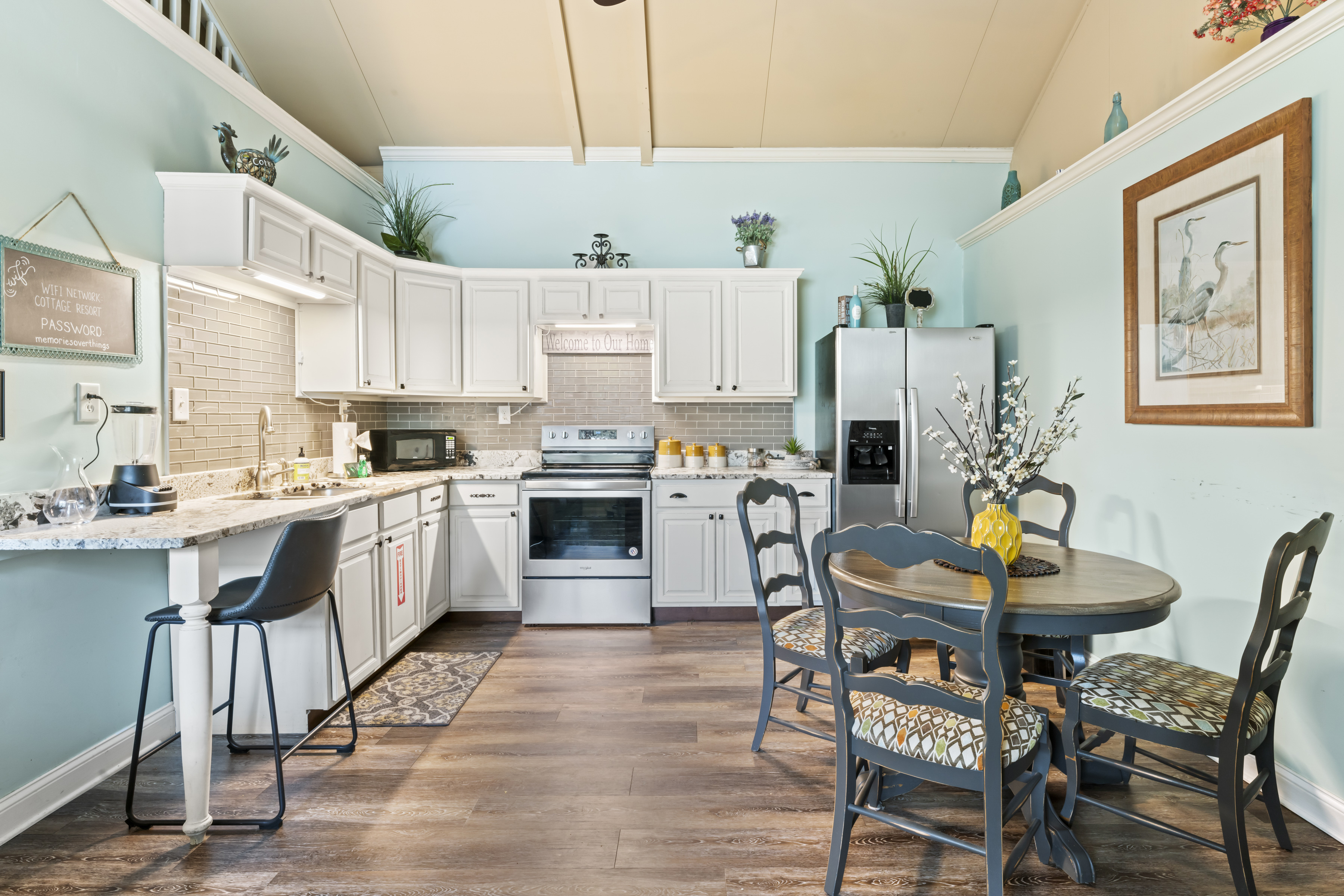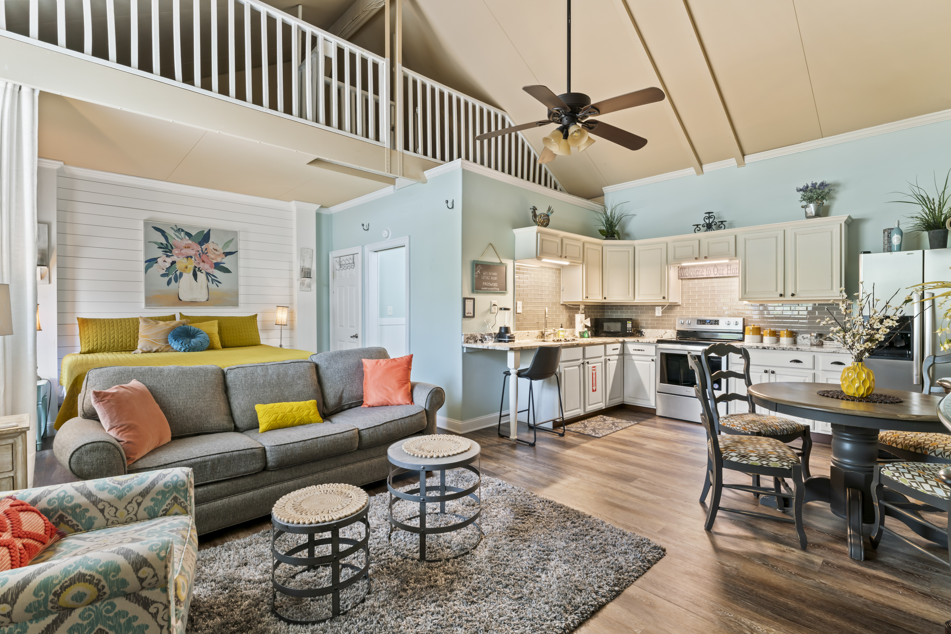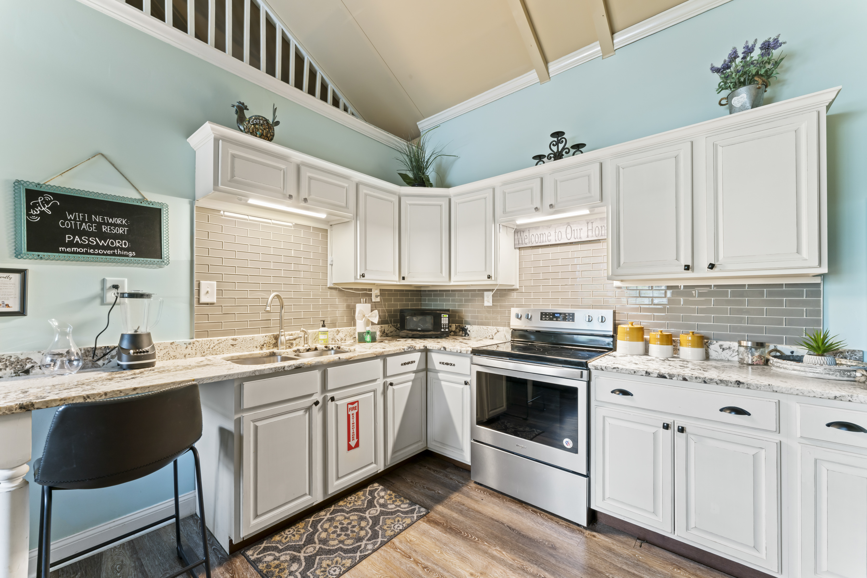 This beautiful, comfortable, spacious 2 bedroom cottage comes with a fully furnished kitchen with all new appliances and granite countertops. This air-conditioned home has a king size master with a bay window overlooking the koi pond, pool and garden area, a queen size bedroom, and a loft area with 3 beds, perfect for kids, with it's own tv! Catch up on your favorite shows on a smart (Roku) 4K TV by logging onto your personal Netflix, Amazon or any other streaming services (we do not provide any content).