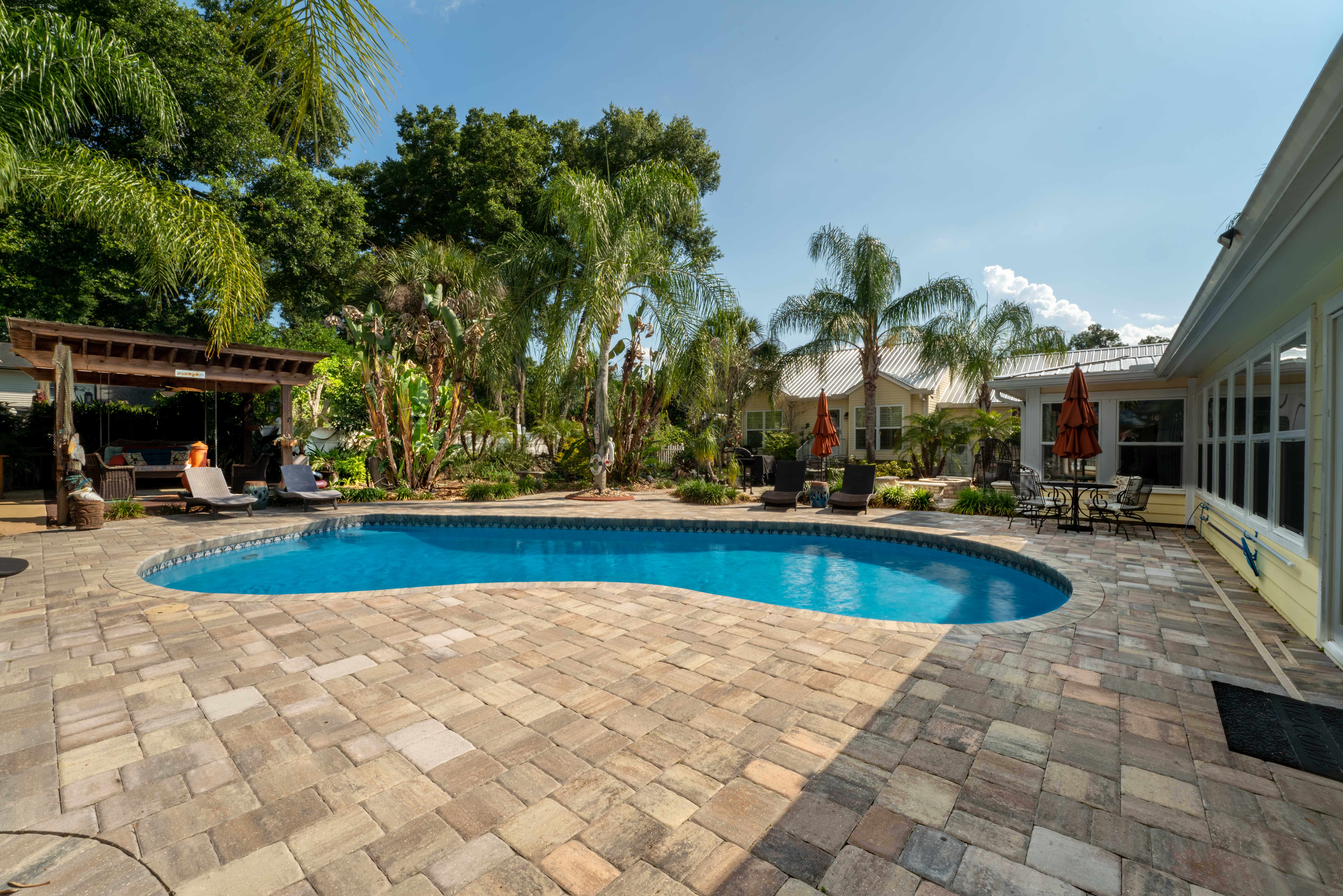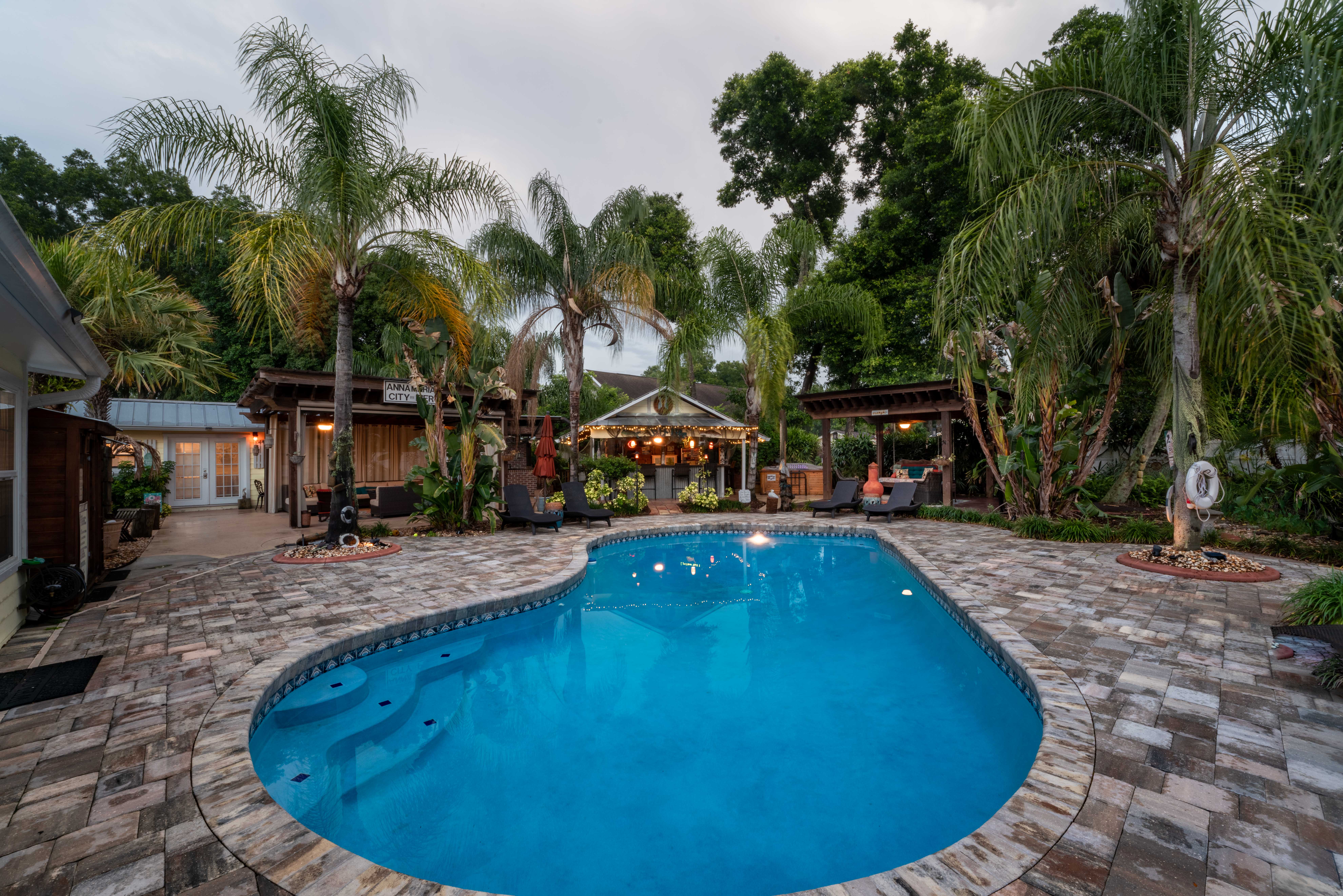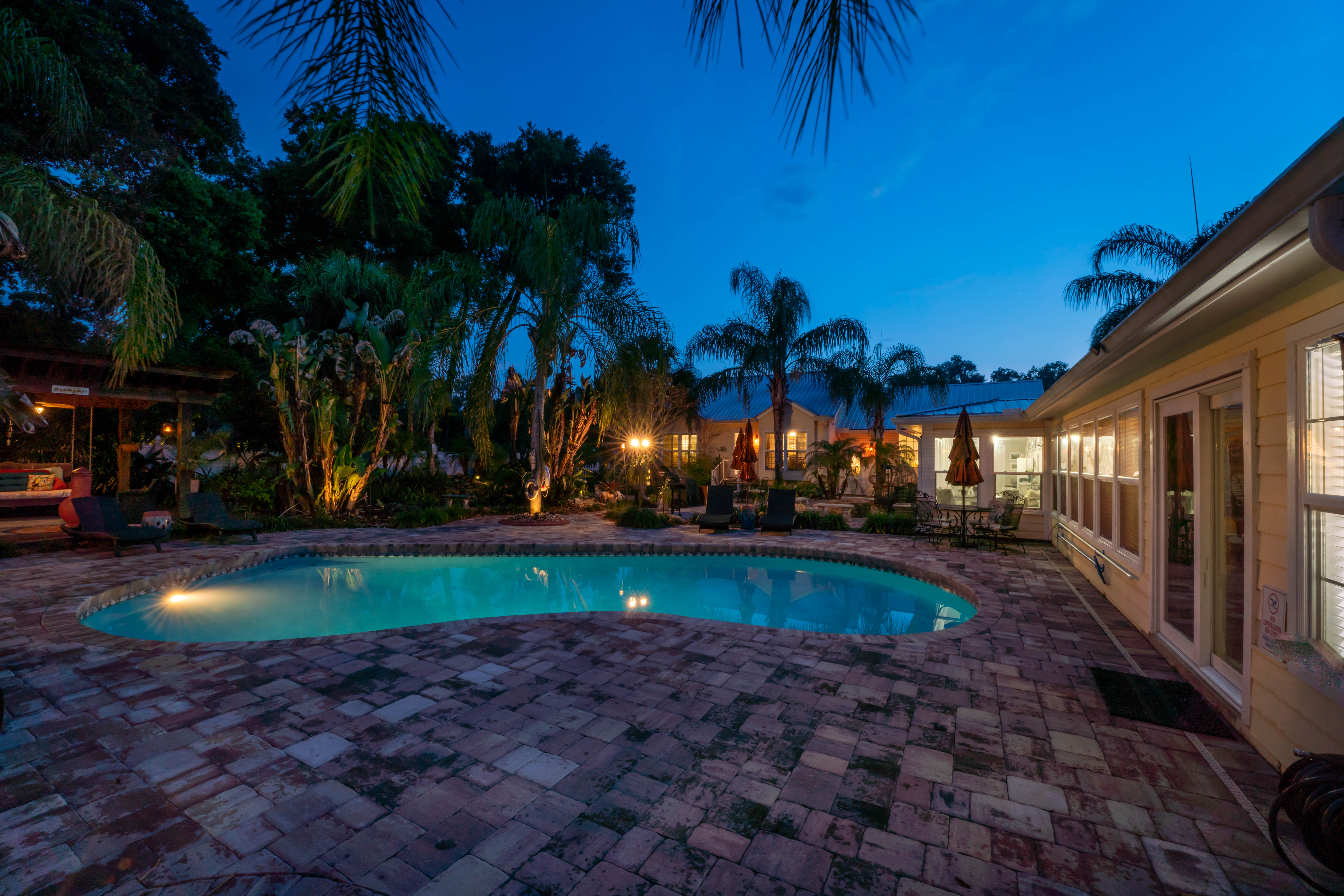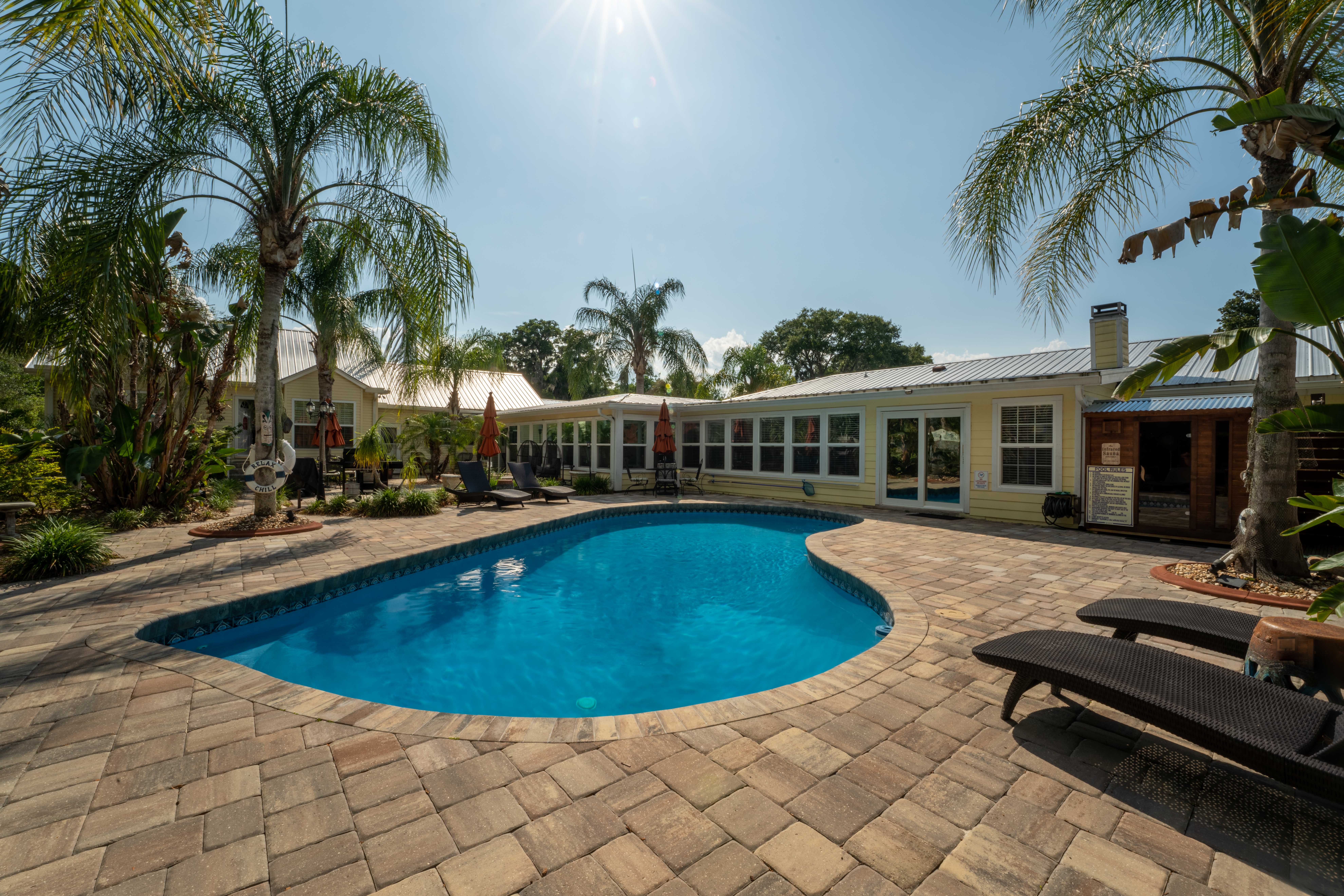 All units share a 7,200 sq ft. common area. Feel free to enjoy this enclosed, outdoor area, by going for a swim, sunbathe by the pool on the chaise loungers, relax by the koi pond and waterfall, sit on the queen-size-bed swing under the breeze of a ceiling fan, or enjoy a drink in the bar while watching the 60” tv or listening to your favorite music! You also have access to a covered patio seating, and an outdoor kitchen, with our 5 different grills (charcoal, wood burning brick oven, or propane). We have an indoor complimentary coffee bar with individual seating areas that is accessible at all times for a quiet place to have a cup of coffee while reading a book from our lending library. There is also a large area for your dog, clean up bags are provided.